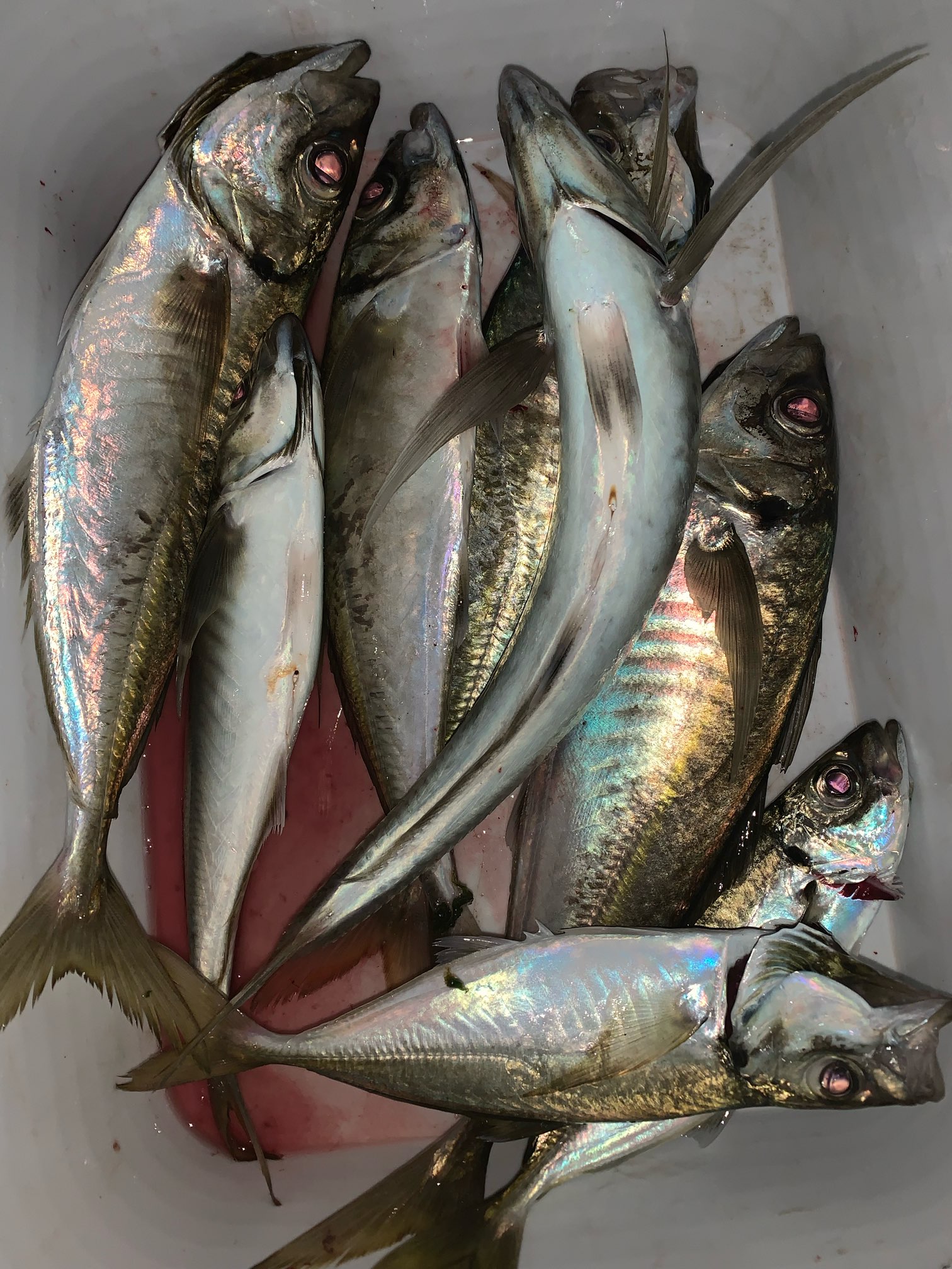雨の中懲りずにまた浜名湖へ大アジを釣りは行きました。前日とは時間帯を変えて行ってみました。雨で流石に人は少なめ。始めて直ぐにアタリが。即アワセでかなり強引に巻き寄せてキャッチしたのは35cmくらいの良いアジ。回遊なので釣れたら直ぐ次のアジを釣る様にします。するとやっぱり連発!!また同じサイズ。ここでアタリが止まり暫く我慢。心が折れそうな頃にヒット。尺無しのアジでした。アジフライ定食サイズだな。。。釣れるだけ良しとします。それからジグヘッドを変えて棚を変え、海毛虫のカラーをグリーンからシラス星に変えてヒット。そこから連発モード。グローピンク、グローホワイト、シラス星で尺無しサイズも合わせ38cmまでのアジを最終10匹釣れました。今回も満足です。海毛虫最高!!