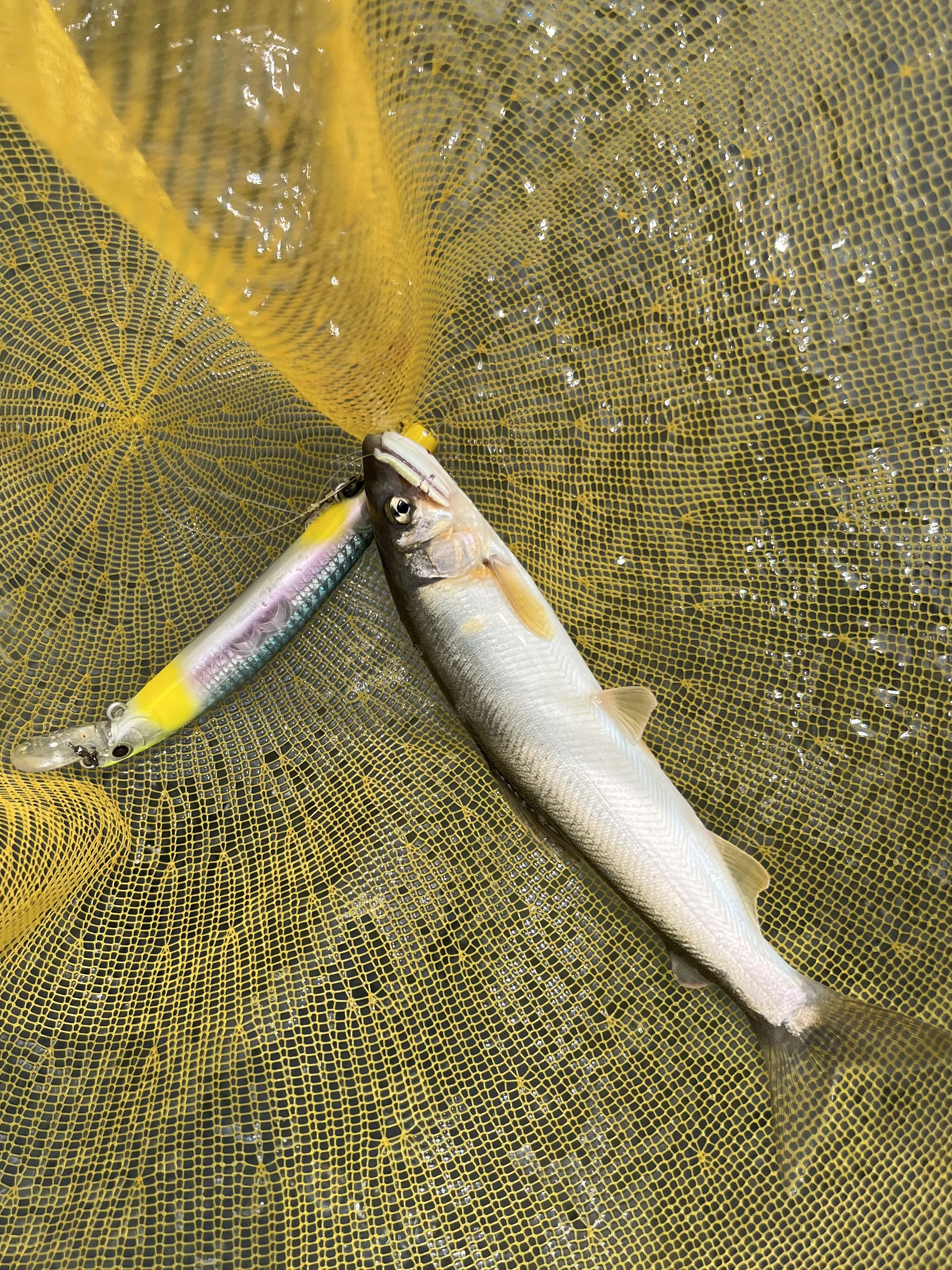 準備をして川へ降りると鮎の跳ねを確認。ルアーを流してみると早々にヒット!ヒットルアーはダイワさんのアユイングミノー94SP-LI。しかしこの後2連続でバラし…ルアーを94SFとローテーションしながらポツポツヒット!
