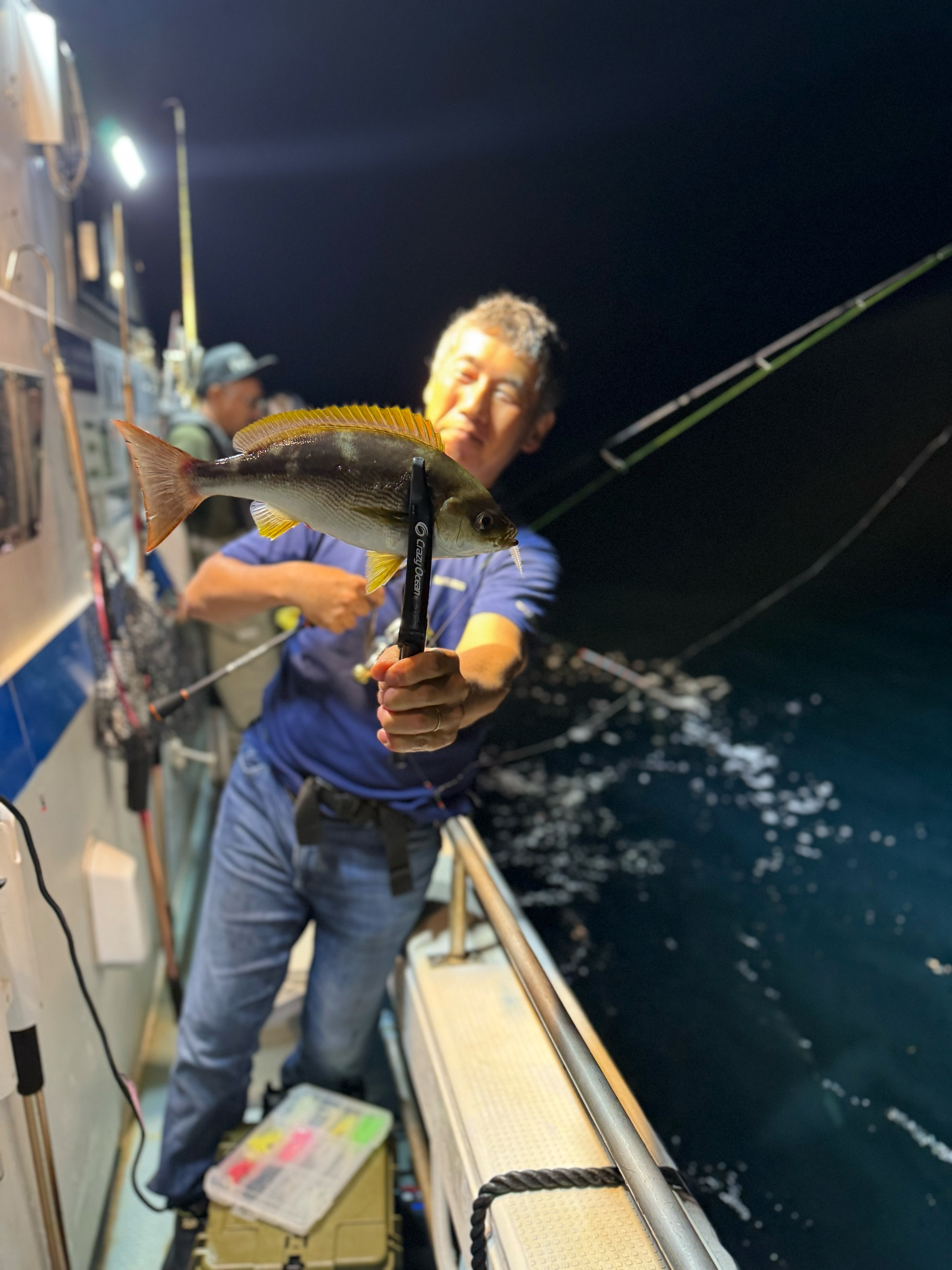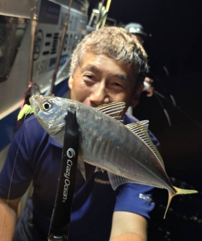 同船の皆さんが海毛虫の1.8インチを使う中、自分は海毛虫の2.5インチでほとんど釣りました。当日のアタリカラーはシラス星。他のカラーは当たらず、再度シラス星に戻すとアタリが来ての繰り返し。