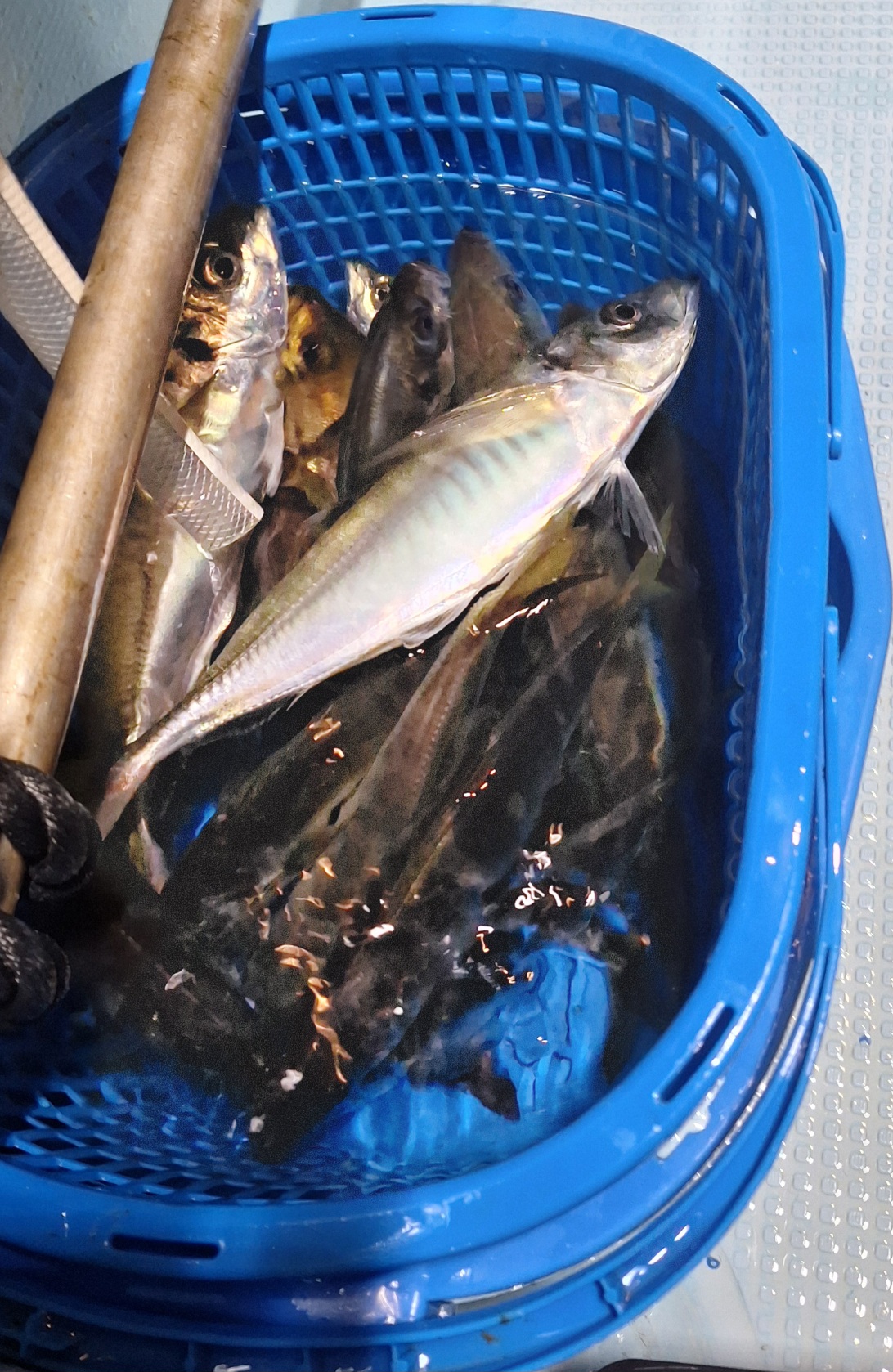 アタリはあるが乗らなくなったので、1.8インチのチャートにするとイサキのようなアタリが!!フォールでアタリを合わすとマサバの良い型、首折り&血抜きしてクーラーに2匹だけキープし帰りました。