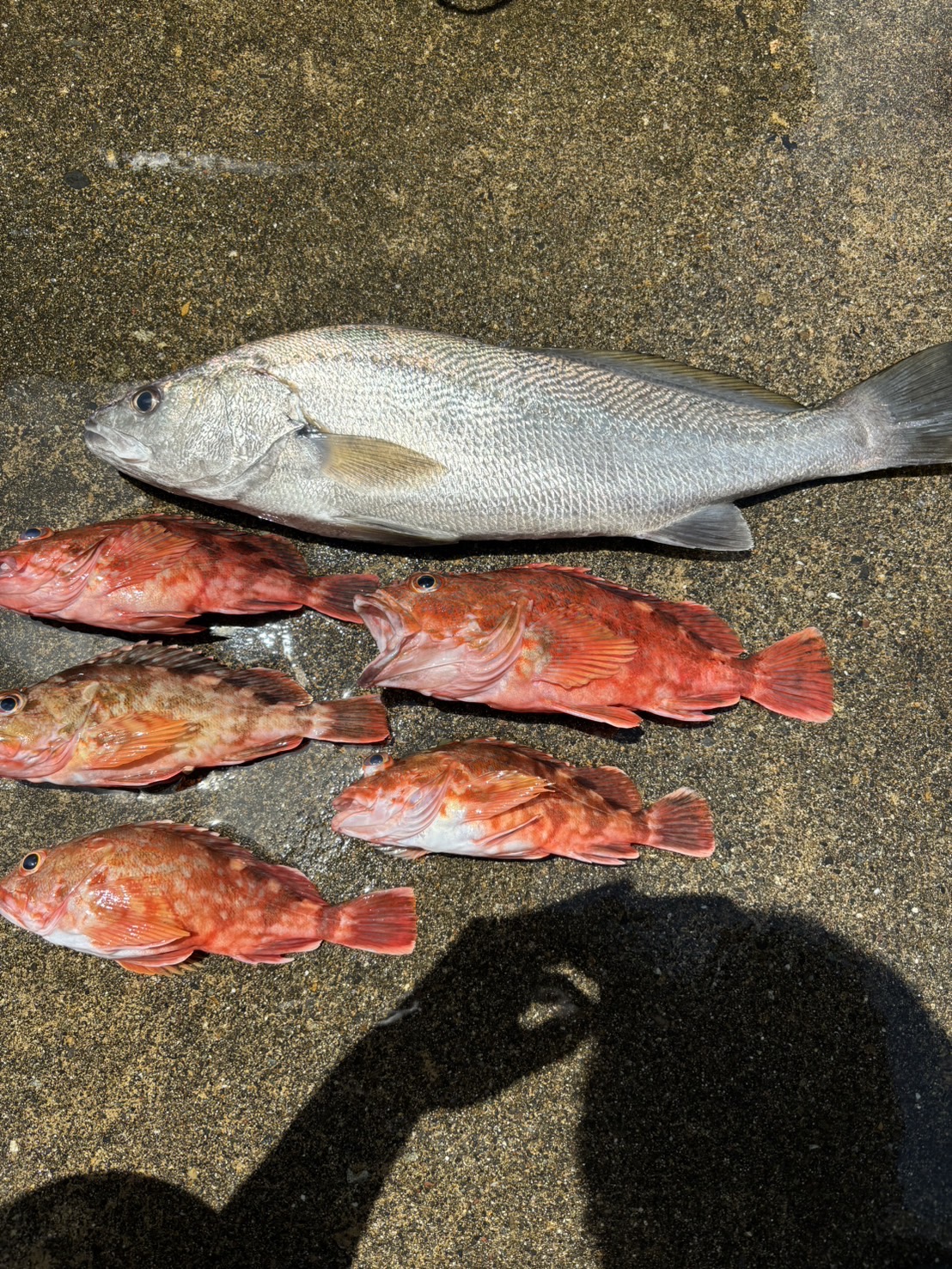 最初のポイントは水深20~30mのポイントでボトムに落としてからリフト&フォールで誘いました。あたりがあるも単発で合わせ切れず伊良湖沖のポイントへ移動、移動後は水深50~60mの根があるポイントに移動しました。伊良湖沖ではテンヤ15号に変更し着底後誘い出しました。結果はカサゴが少々と大きなニベでした!