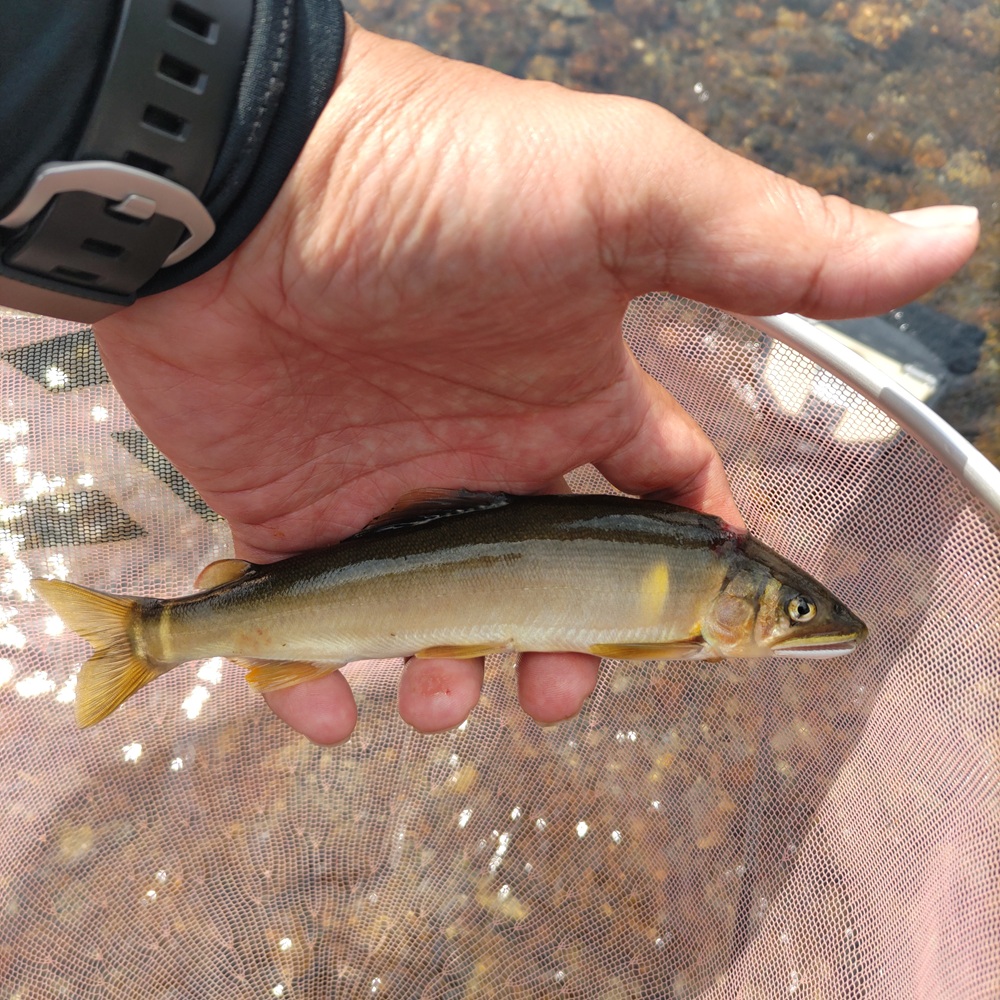 今日は曇りで風もありかなり涼しく感じます。早速、チラシ針で指5本分くらいで釣り出します。鮎がいるのは間違いないもでルアーを止める位置をズラシながら釣っていきますがやはり掛からない!?それではとチラシ針にハリスの長さを指7~8本分(約14~16㎝ほど)に変えてルアーを入れます。2分ほどで目印が吹っ飛ぶ、めっちゃ気持ちの良いアタリがきます。しかもアユの引きも強いので興奮度がアップします。この後も長さを変えて釣ってみましたがこの日の状況はハリスの長さを指7~8本分が最適でした。