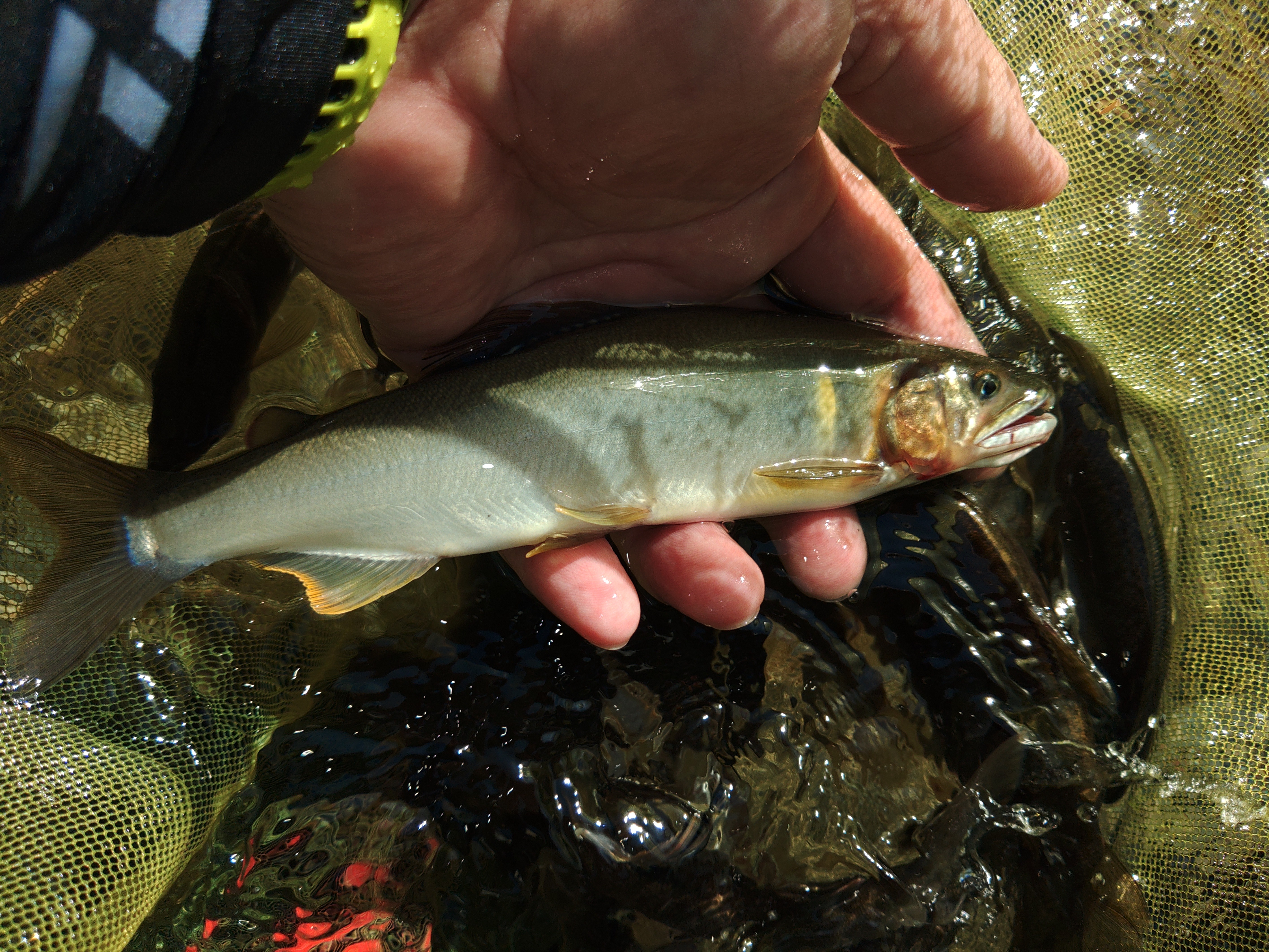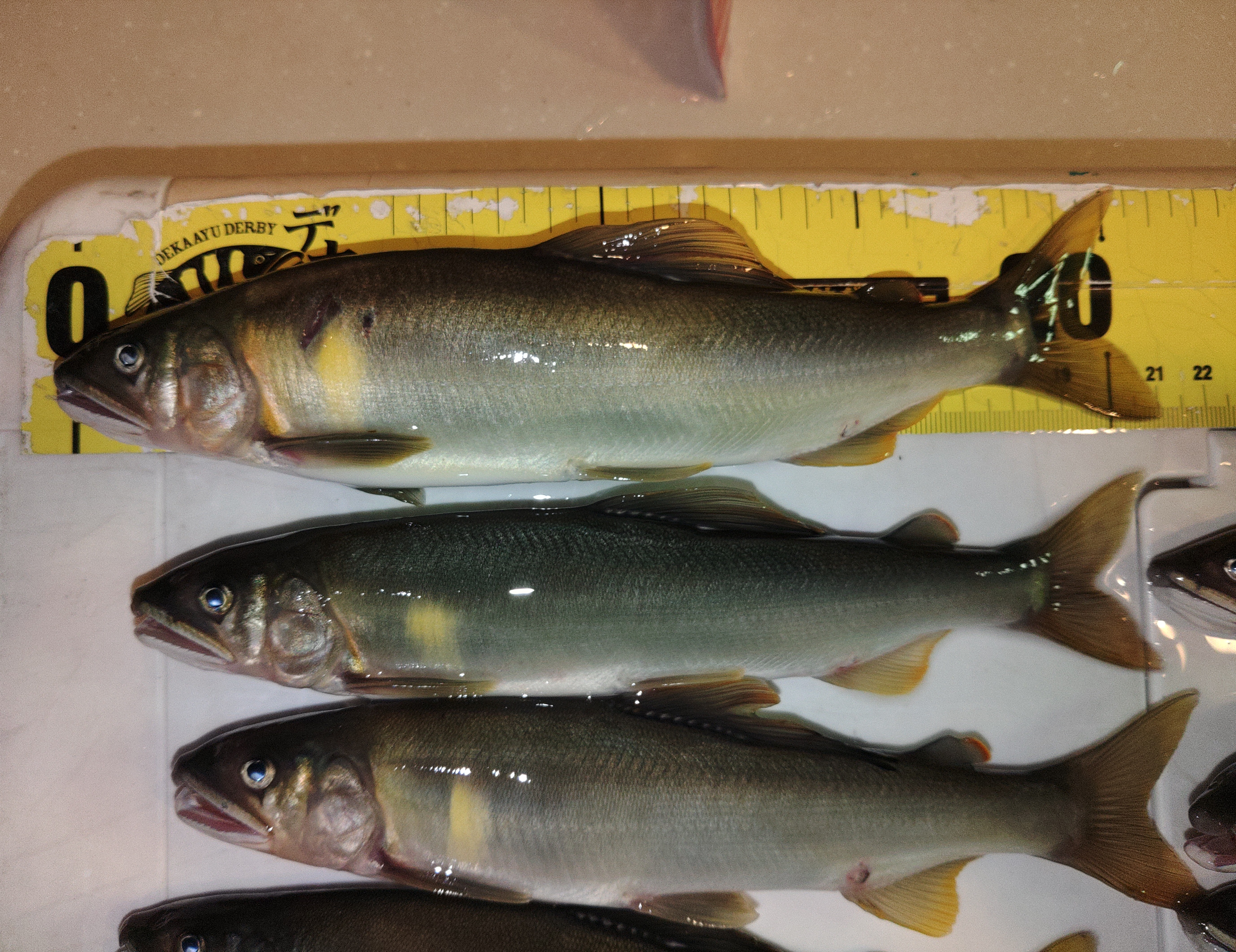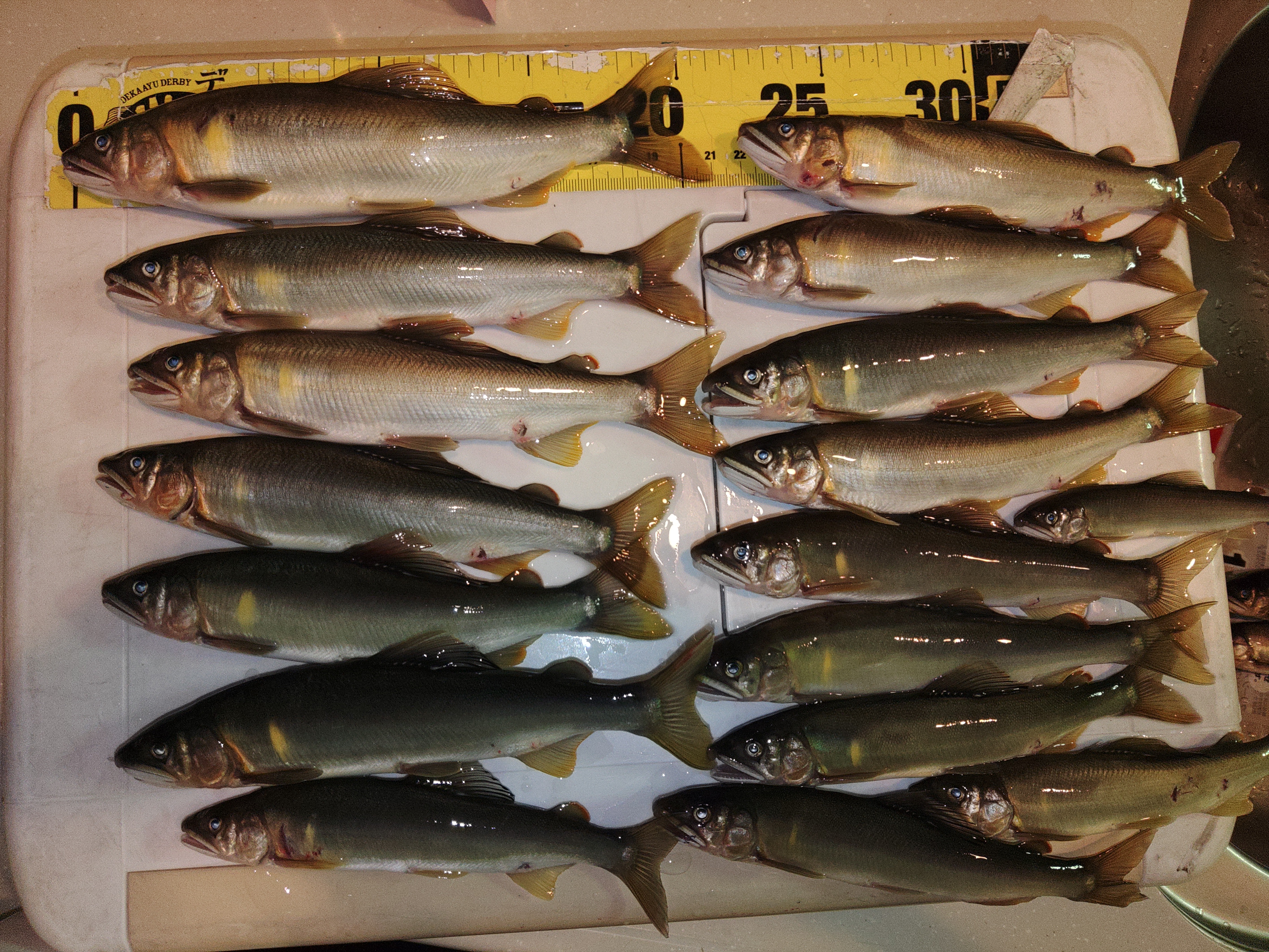 解禁から5日目の白川に釣行してきました。解禁から大雨で増水した川も、平水から少し高いぐらいでちょうど良い状態で、天気も良く最高な釣り日和。しかし、考えることはみな同じで川は解禁さながらの満員御礼状態・・・。 いつもよくいく中川橋の下流が入れそうなのでとりあえず竿を出しました。今年の白川は成魚放流をしており、試し釣りでは21㎝の良型が釣れていたので期待大。瀬落ちでオトリを泳がすと”コツン”と小さなアタリ? 掛かっていたのは10㎝ぐらいのビリ鮎・・・。 大きんじゃなかったか? 気を取り直しオトリを泳がすと今度は流心で”コツン”? アタリは小さいが今度は16㎝クラスのオトリサイズ。その後もポツポツと掛かり、午前中で11匹の釣果。しかし、上流で釣っていた三浦店長は18~21㎝の良型ばかりを20匹近くの釣果との事・・・。午後から下流の瀬が空いたので釣り下るが、鮎が抜かれた後なのか反応が少なく15時までに6匹追加しただけで終了となりました。結局10~21㎝を17匹の釣果でした。