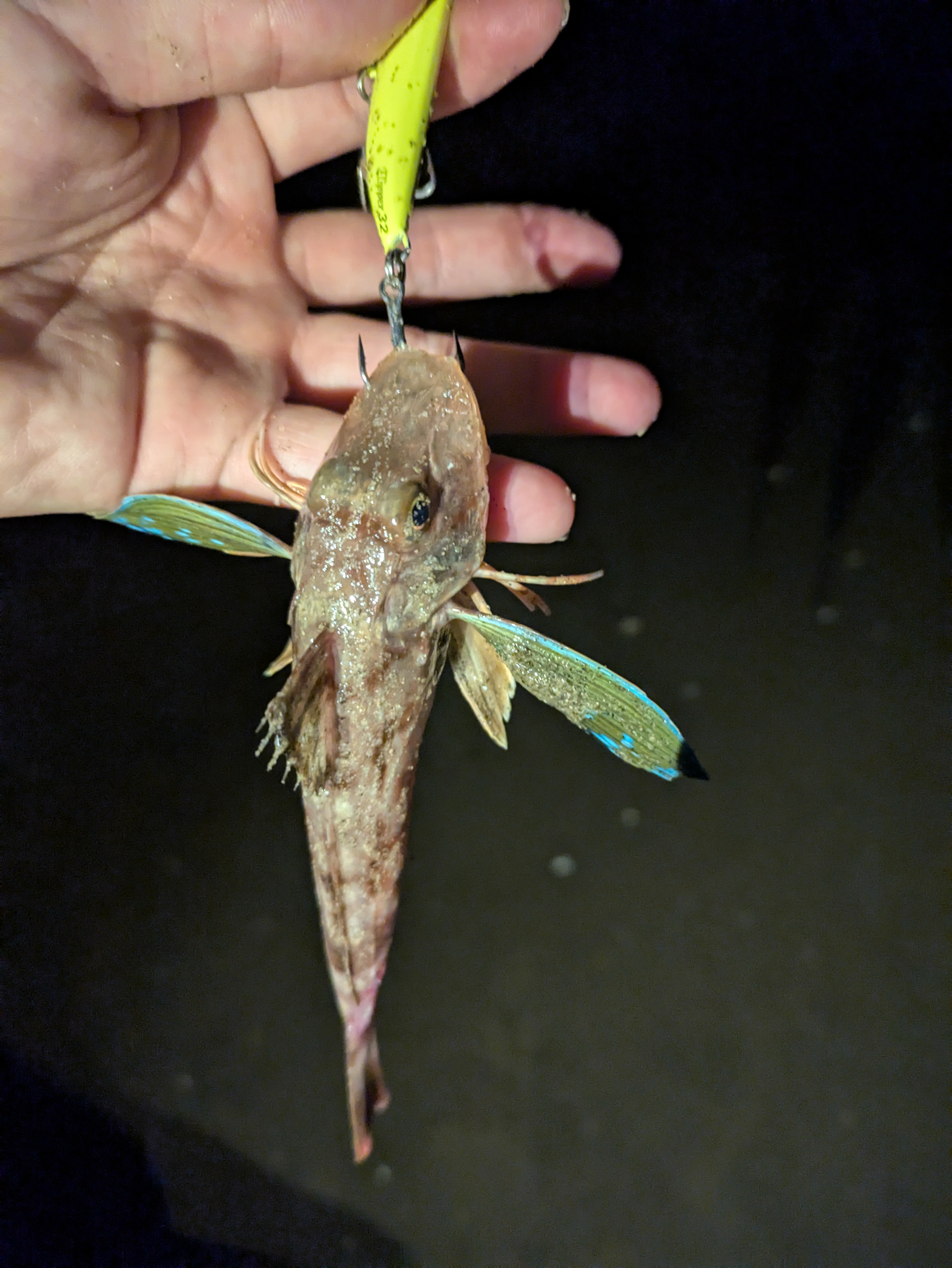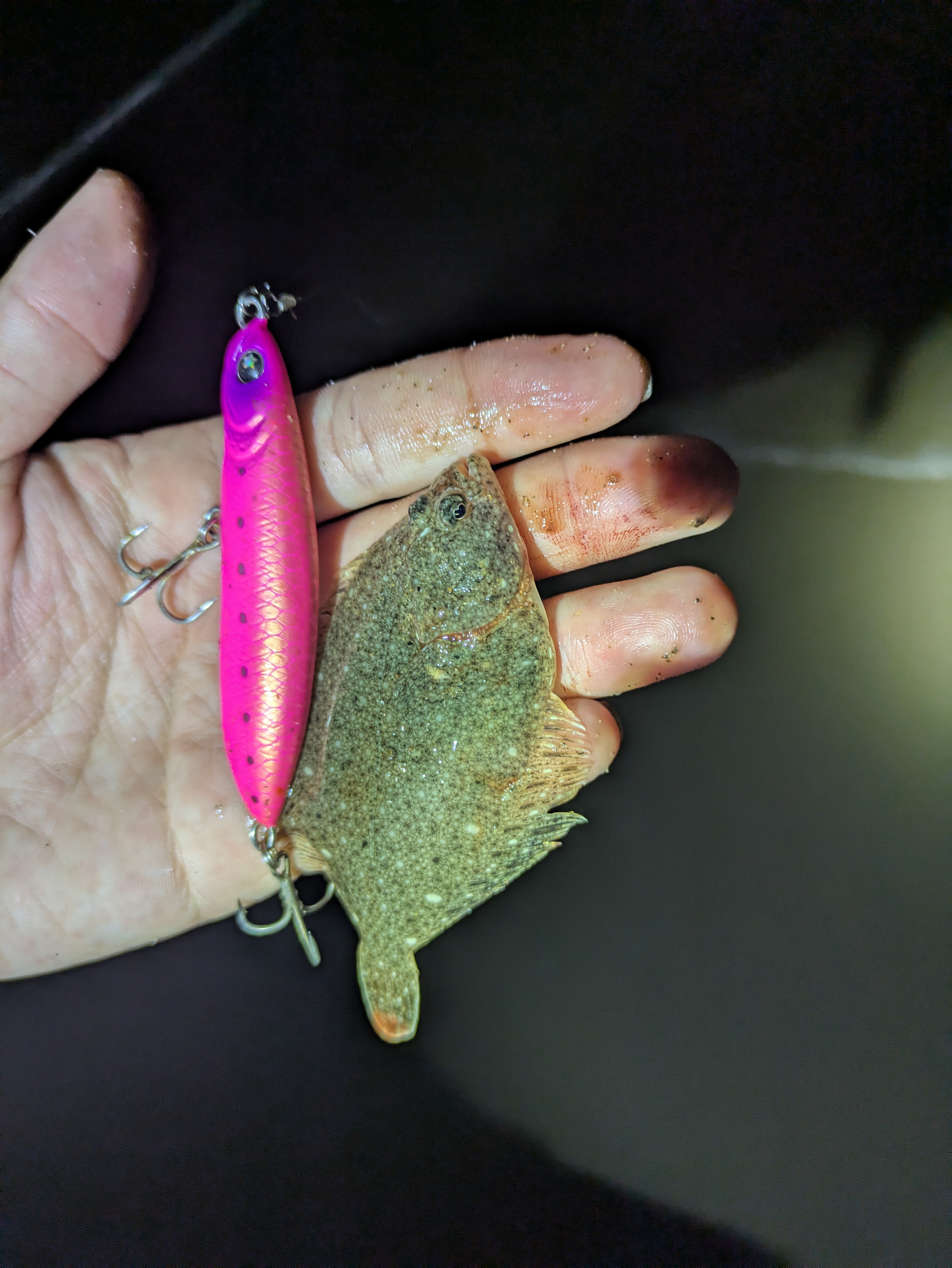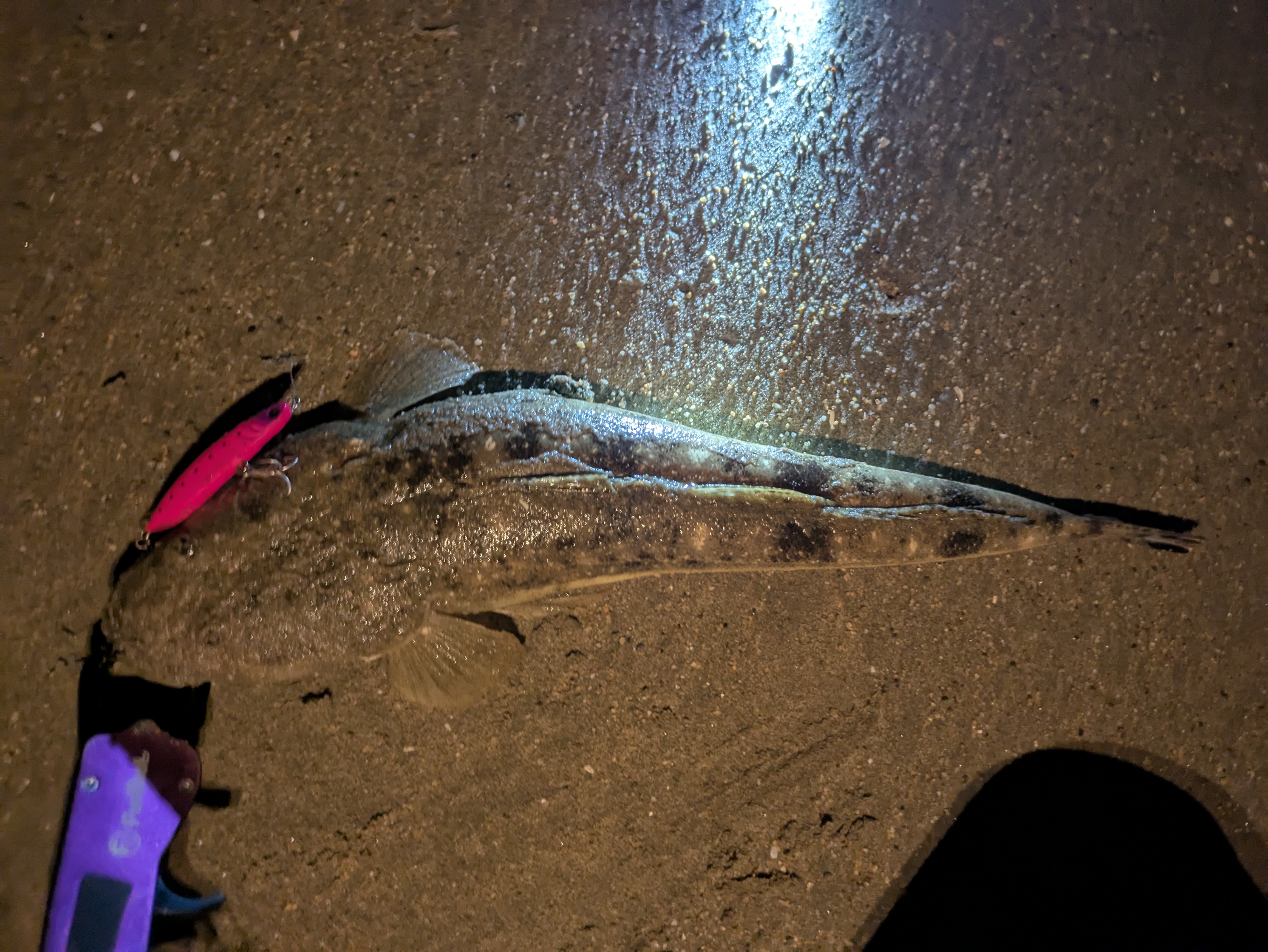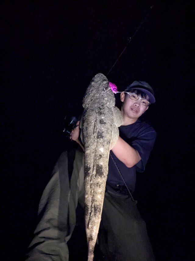 日中は雷雨で釣行できなかったので、雨後のナイトサーフへ行ってきました!雨後もありここ最近の豪雨で川周りよりも遠目の方が良いかな?ということで川が絡みにくい場所へエントリーしてみました!最初は私のパイロットルアー、フリッパー32gでド遠投します。久しぶりだったのである程度肩慣らしキャストしてリールの巻き取りを数えます。だいたい80~90巻きくらいで手元にくる感じでした。そこからは歩きながら、着水からの底取で3~4秒くらいでした。キャスト後は最初4巻き底取り、4巻き底取り…。でリフト&フォールしていきます。時折ベイトが2回目から3回目で引っ掛かってきており、少し遠い様子。と思ったところでヒット!するもバラしてしまいました。そこから再度投げ倒して30mほどズレたところでまたヒット!これはスレの感じかな?と思ったら走られてフックアウト…。少しメタルジグでは速すぎて喰いが浅くなってしまうのかな?ということで、フットビー7522!ベイト?かもしれないカレイとも同サイズでワームよりも飛距離がでるのでセレクトしました。2投目フリッパーと同じようにリフト&フォールでフォール中に早速ヒット。久しぶりにマゴチをキャッチできました!そこから再度フットビー7522をキャストして横10mズレたところでリフト&フォール中にヒット!横走りすると思ったら何か沈みものがあったみたいで絡まってしまいマゴチがバタバタしてると思ったらフックアウト。そして根掛かり…。そのまま角度変えながら外してみようとしたもののフットビーさん殉職。ごめんなさい。結果的には4バイト1キャッチでした。雨が降ったものの岸によってきた感じなのでしょうか?また改めて釣行してみます。