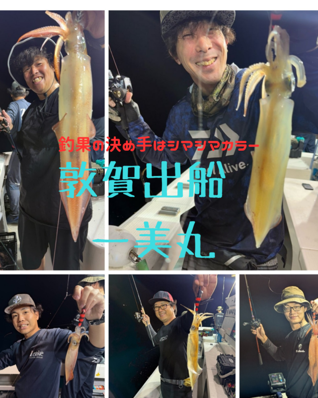 大潮で終始潮の流れが早く、雨の影響で濁り活性も低く船中で最高7杯とテクニカルでしたが、ブラックのシマシマカラーが効いたのか釣果2杯ともスッテアタリでした
