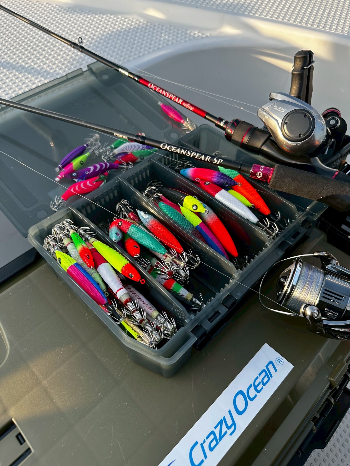 最近の傾向として、マイカとスルメイカが混合で釣れており、夏らしく深場のポイントでも漁火の効果が効き出すと20m前後の浅ダナでも釣れ出していて釣りやすくなってきました。中でも浅場のポイントはマイカ、深場のポイントはスルメが多い傾向にあるようですが当日は深場、約90mの水深のポイントでした。