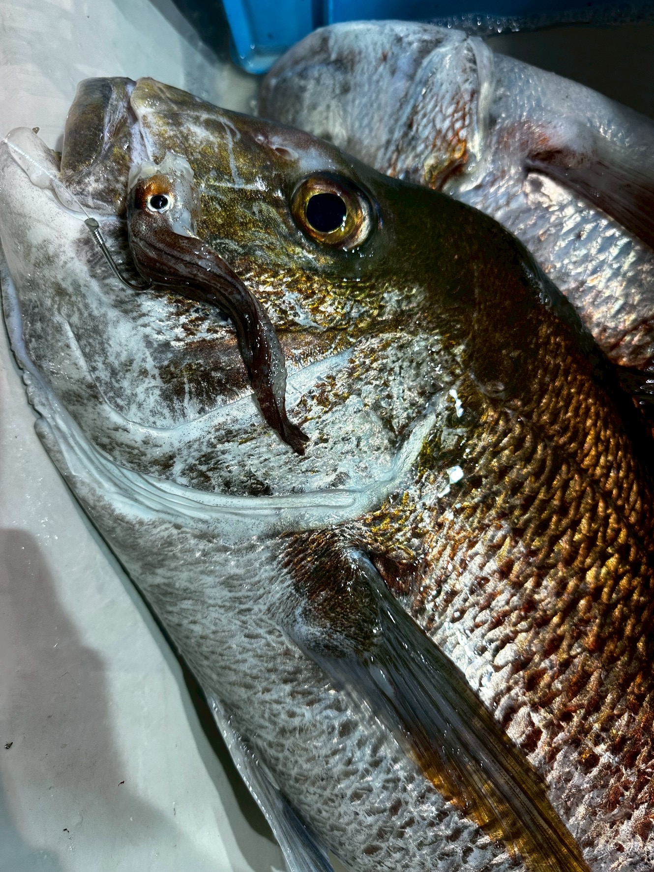 また、深場でイカを掛けて巻いてくるとマダイに強奪される為、船長に許可をとりジギングタックルに持ち替え、イカダイ仕掛けを落とすと一発でアタリ入れ掛かり状態で40〜80センチのマダイを5枚も釣れてしまいました。※イカダイは禁止の船もあります。必ず船長に確認の上行って下さい。オマツリで迷惑をかけてしまう恐れがあります。