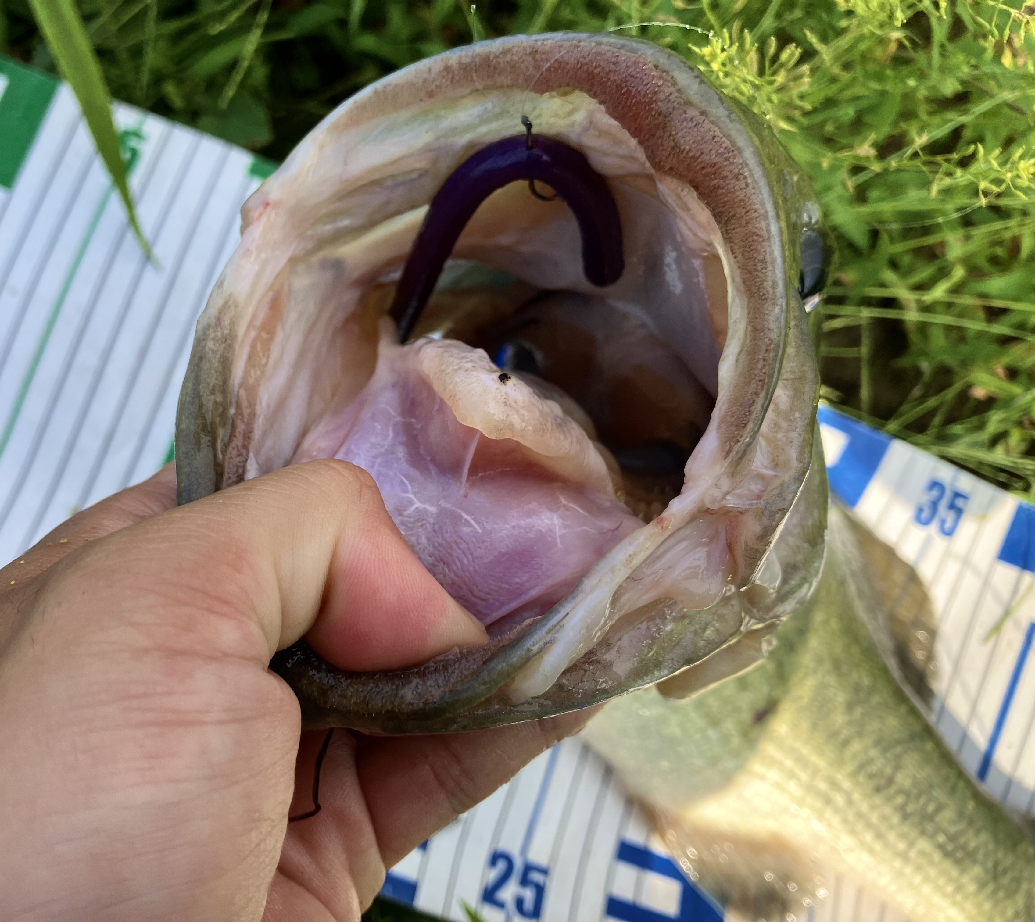 虫系ワームを岸から落として見ますが、あと一歩距離が詰まらない、、、。2投でルアーをレインズスワンプJr.#UVスカッパノンの0.9gネコリグに変更し、ミミズが落ちてきた演出をするとバイト!
