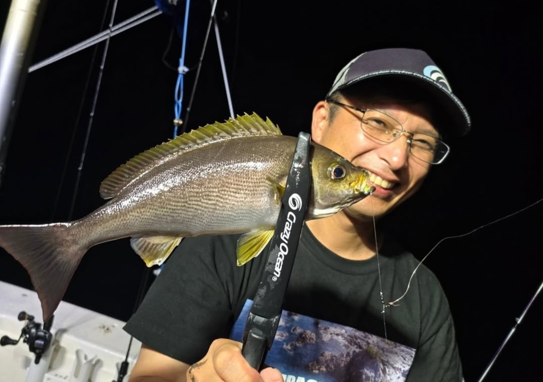 ゆっくり目の18時出船。ポイントまでは30分くらい。船長も「明るいうちはたぶん釣れないですよ」とのこと。19:30頃までアタリなく・・・ライトが点灯して数分後。フォールでアタリ!!30㎝くらいのアジ!!一番魚!!それからは周りでもポツポツ釣れて20時ころ、船中一匹目のイサキが左舷ミヨシ付近で上がる。船長曰く「いつもより早いなぁ…これは釣れる潮かも。」俄然、やる気モードに。数分後に私にも竿にもたれるアタリからのアジとは明らかに違う突っ込み!!今回、ダイワさんに貸していただいた紅牙EX N67MB/TGはイサキの引きにも順応。フルソリッドのブランクがしなやかに曲がりイサキの引きに追従。バレる気がしません!!上がってきたのは30㎝超えのイサキ!!エサで釣るのとはひとあじ違う喜び。周りでもイサキやアジが次々に上がっています!!竿頭でイサキ16匹!!全員で70匹は超えていたと思います。