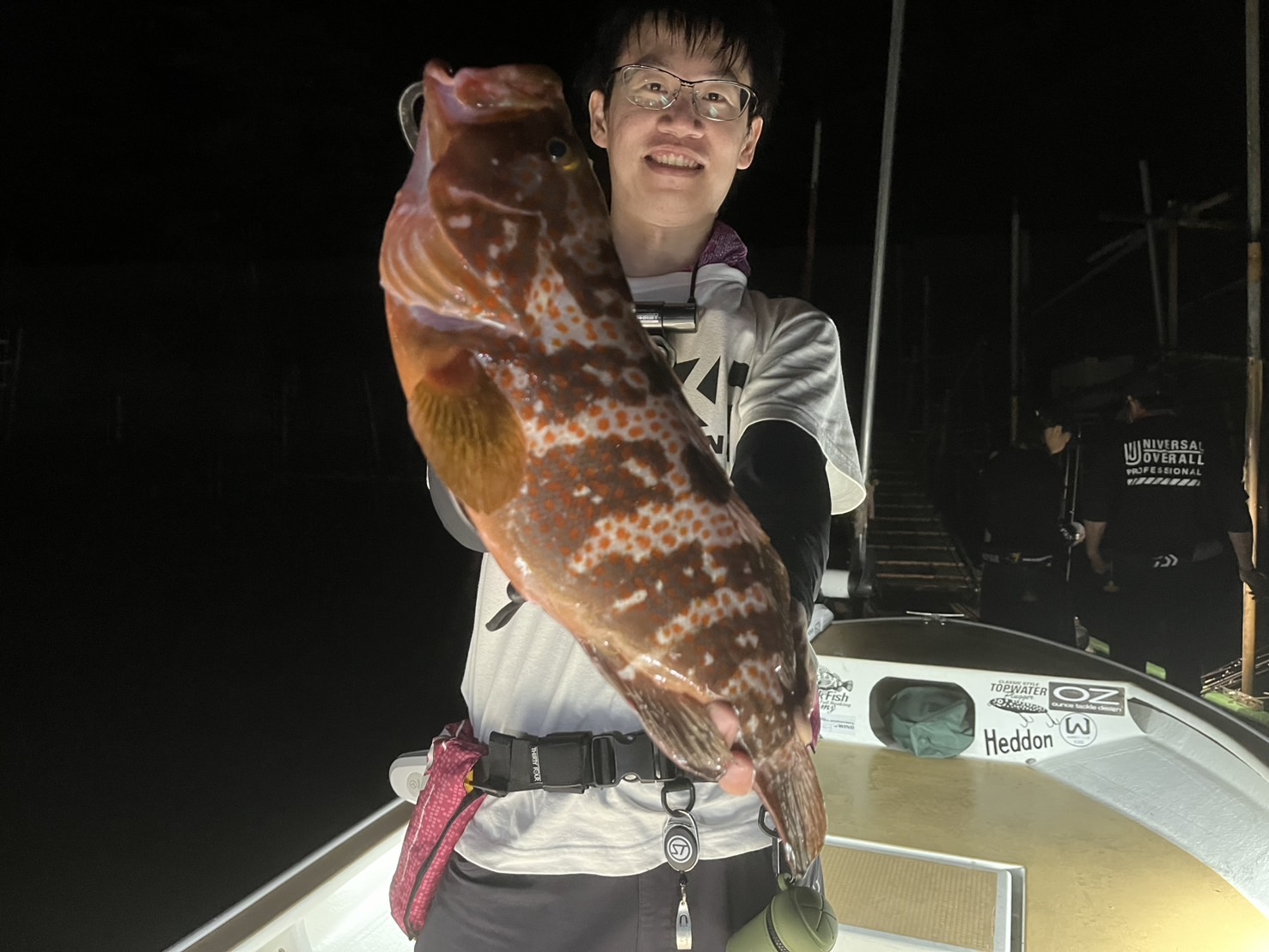 暗くなってきたあたりでキジハタ狙いに!バグアンツ4インチに20gの直リグをセット。ゴツゴツを感じながら誘っていきます。根掛かり多発ですがめげずに誘っているとガツンとアタリが!即座にあわせをいれるとかなりの重量感!上がってきたのはキジハタ!43cmの良型!いい釣りができました!マゴチ、キジハタともにヒットカラーは赤金です。やはり伊勢湾、名港は赤金が圧倒的に釣れます!