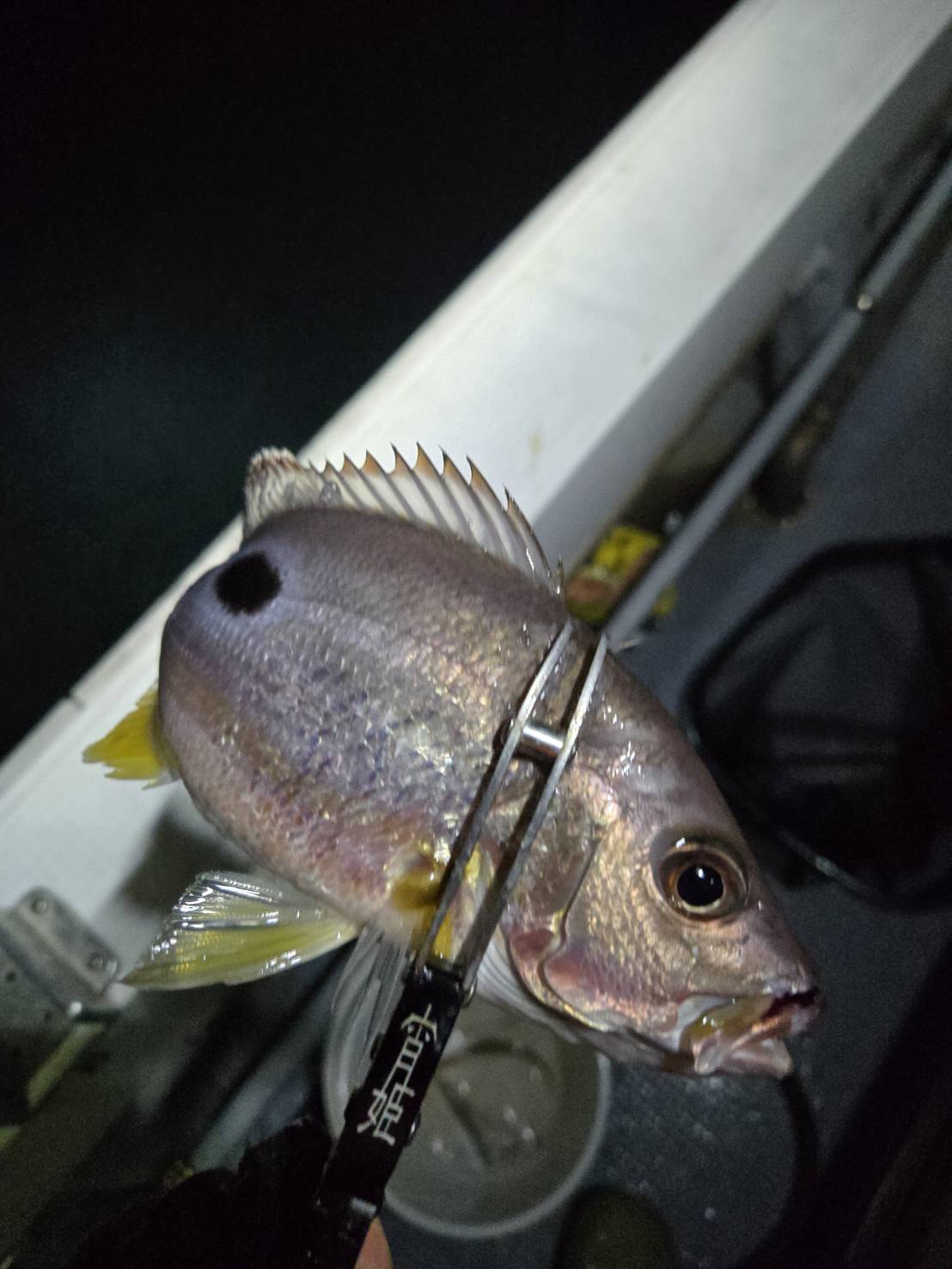 途中、ボトム付近で猛烈なアタリ!!!ガンガンに引きます!あれ?マダイかな?と思いましたが、クロホシフエダイ!