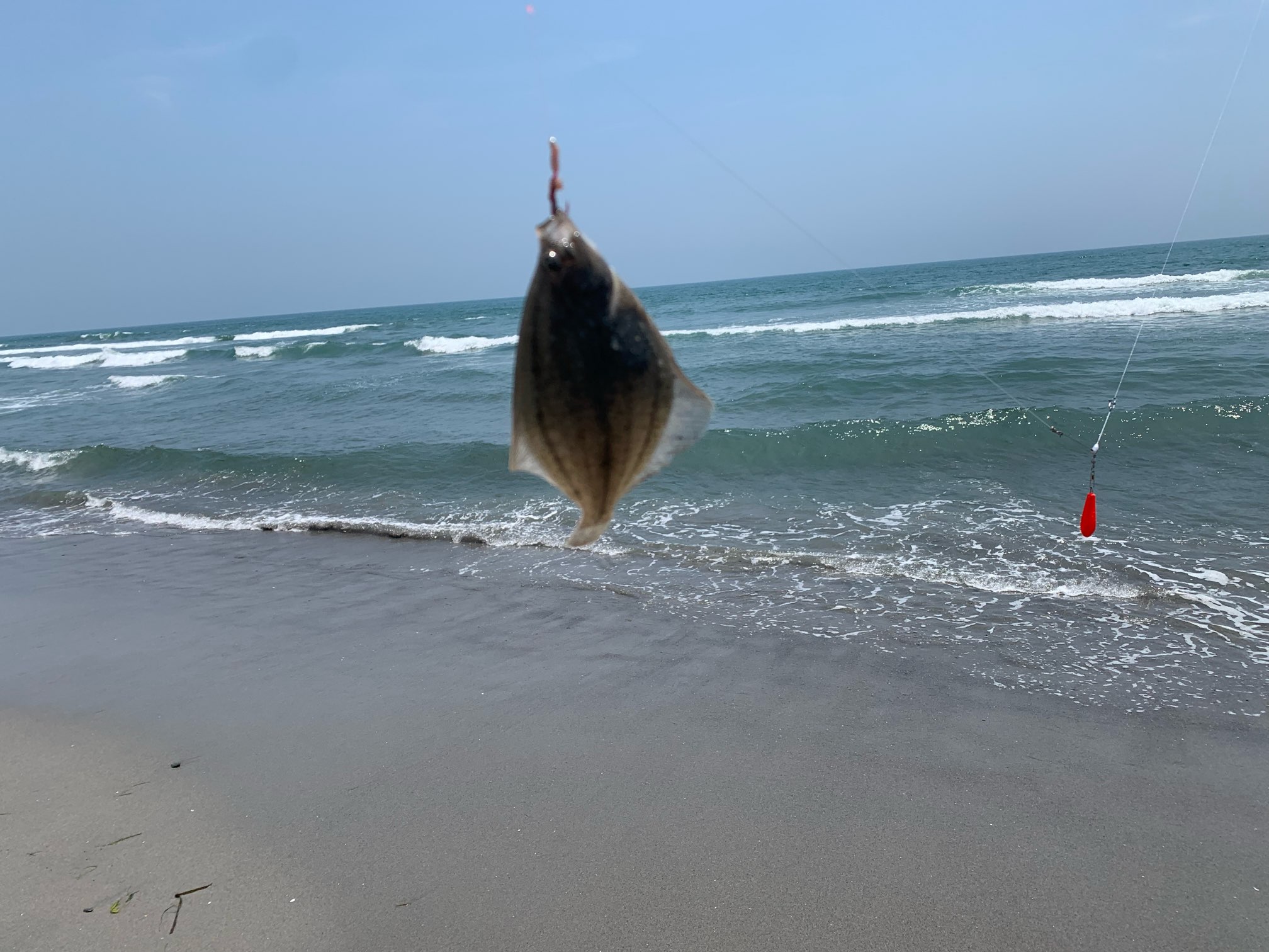 遠州サーフへチョイ投げでキスを釣りに行きました。潮止まり前後でしたが1投目から釣れました。軽く投げて底をゆっくり引いては止めるを繰り返すとアタリがきます。そのままゆっくり巻き続けると追い食いすることも有ります。釣れるのは20cmくらいまでのキスです。ハリを飲み込まなかったピンギスはリリースしました。フグもいるので仕掛けを切られます。仕掛けは2〜3枚は用意しましょう。フグが多い場合は少し歩いてポイントをずらすといいことも有ります。近くで手軽に楽しめて釣れるのでおすすめです。水分補給と暑さ対策はしっかりとしましょう。肌着、帽子、日焼け止め、偏光グラス、タオルなど準備しましょう。
