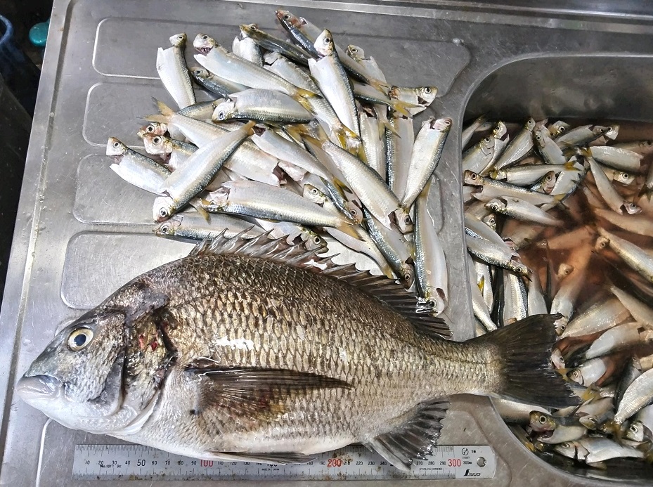 朝一サッパ狙いで投げ始めますが反応が良くない、1匹ずつ釣れる程度なので投げ分けて群れを探して釣りをしていると日が昇って来るとポチポチ掛かる様になって来ましたが暑さもハンパなく10時半一端休憩します。この時点で150匹ちょっと休憩して午後の釣りを開始しますが暑さが更に厳しくなりサッパの反応もイマイチ、雨が欲しいところです。2時間弱で50匹ほど釣り全体で213匹でした。ラストに手前で重い魚が掛かりバラさない様に丁寧にやり取りして15分以上掛け何とか浮いたのはクロダイでネットに入れ確保・・・この暑さの中でコレは結構キツイです。サイズは45㌢ほどでしたが体力がある個体でしたので全然寄らず苦労しました。
