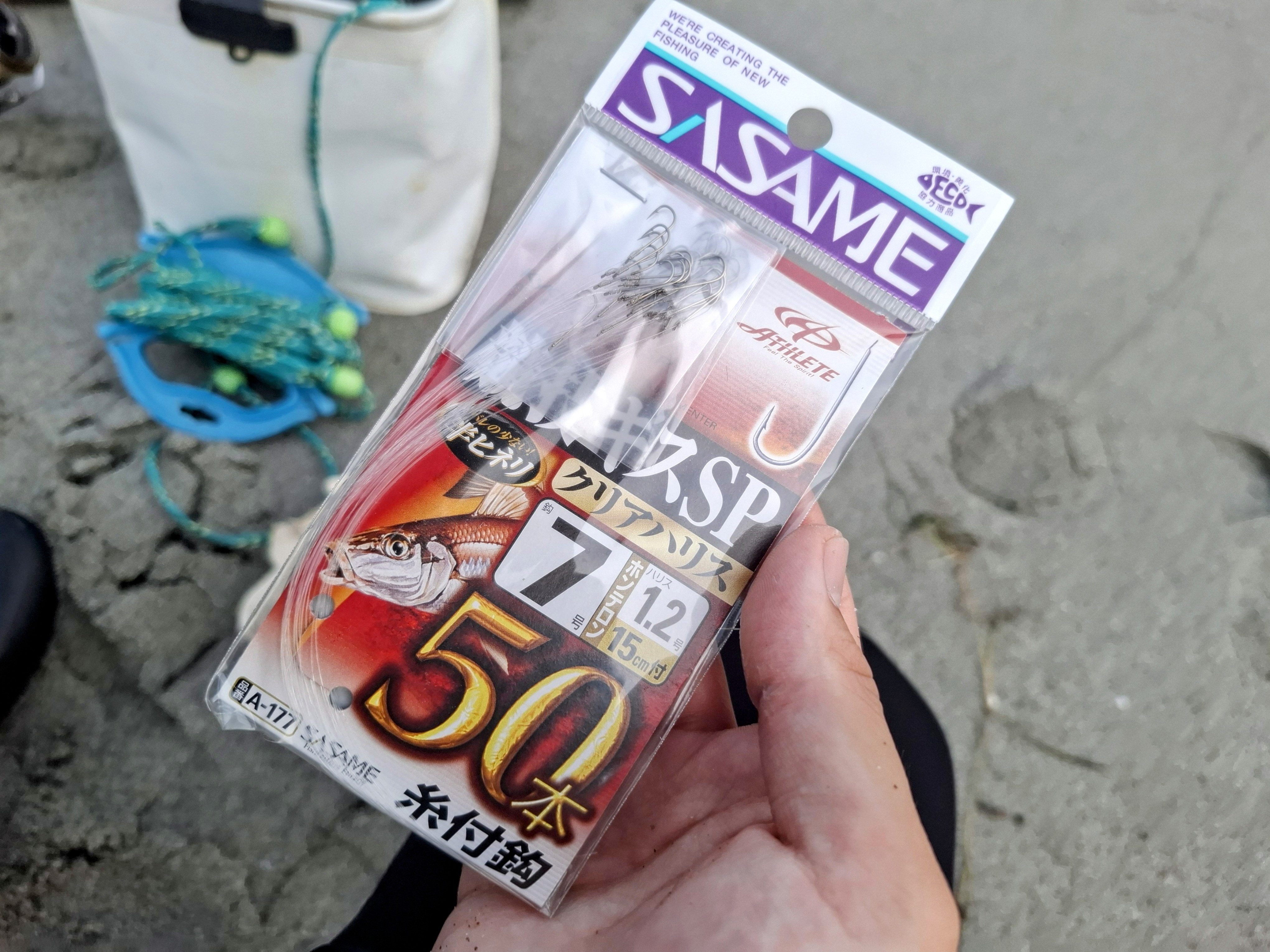 使った仕掛けは競技キスSPの7号50本入り。 一般的な完成仕掛けと違いハリスを結んだ鈎が入っているだけで幹糸 (モトス)は付いていません。