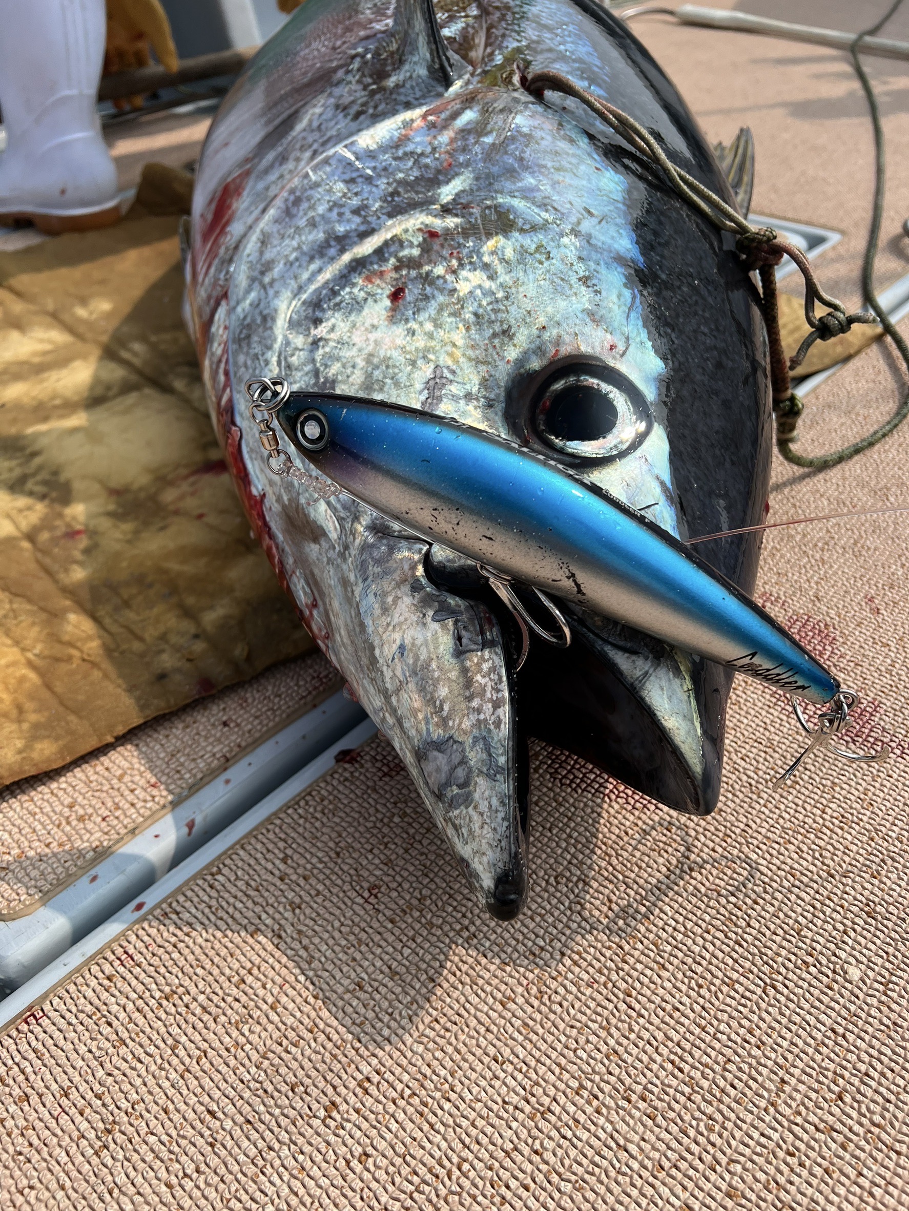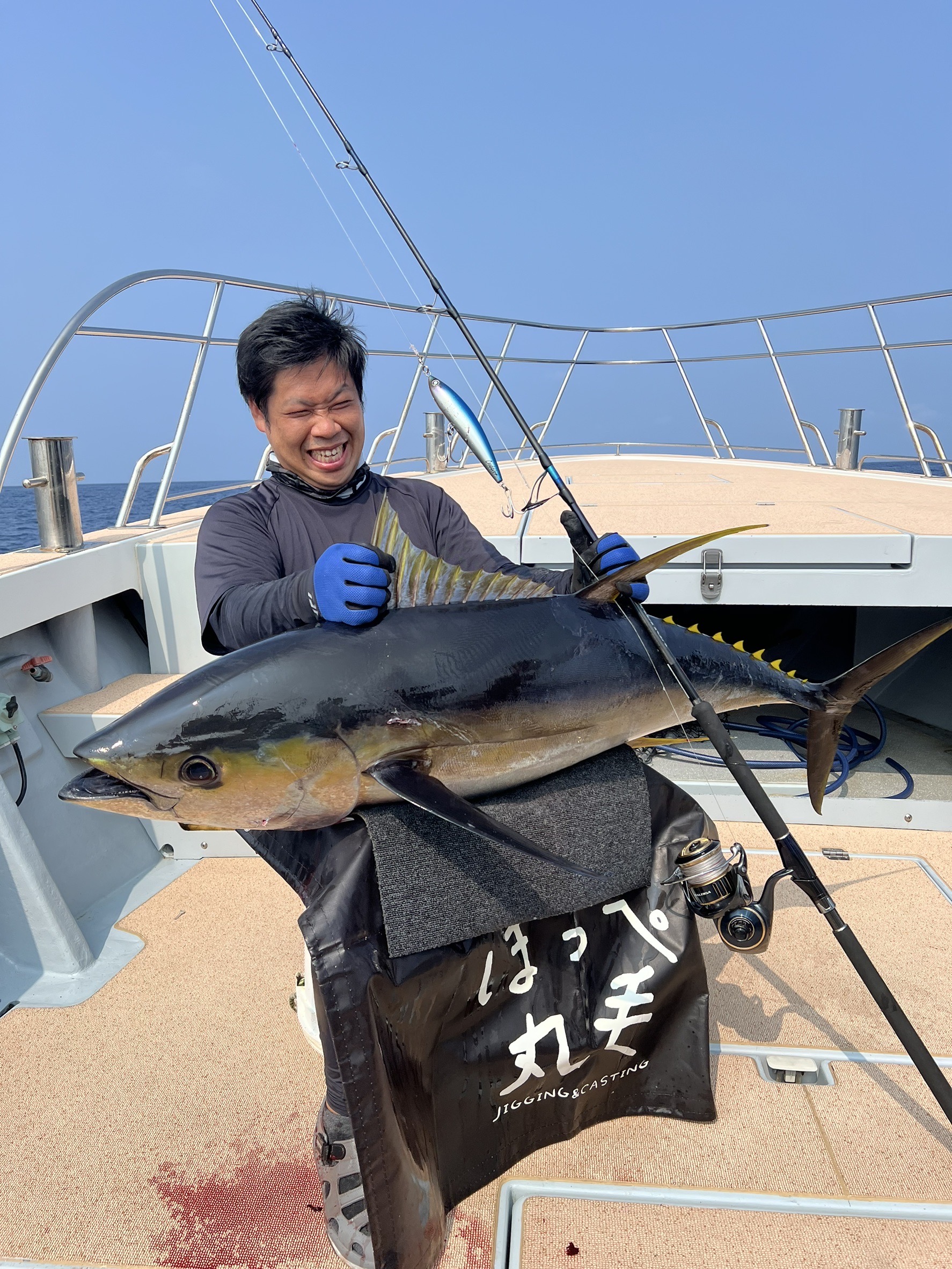 この日は朝から志摩沖へ。ソナーにたくさんのキハダの反応があるようでキャストはしますがなかなか水面までは出ない状況でしたが午後から一気に活性が上がりました!あちこちでナブラが発生!まとまったところにキャストで一撃でした!42キロのキハダでした!ヒットルアーはダイワのカドラー200飛距離抜群で使いやすいルアーです!