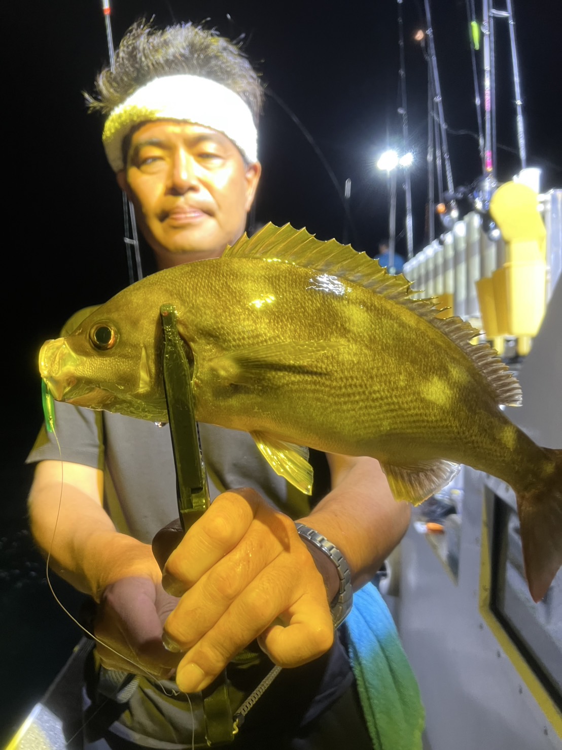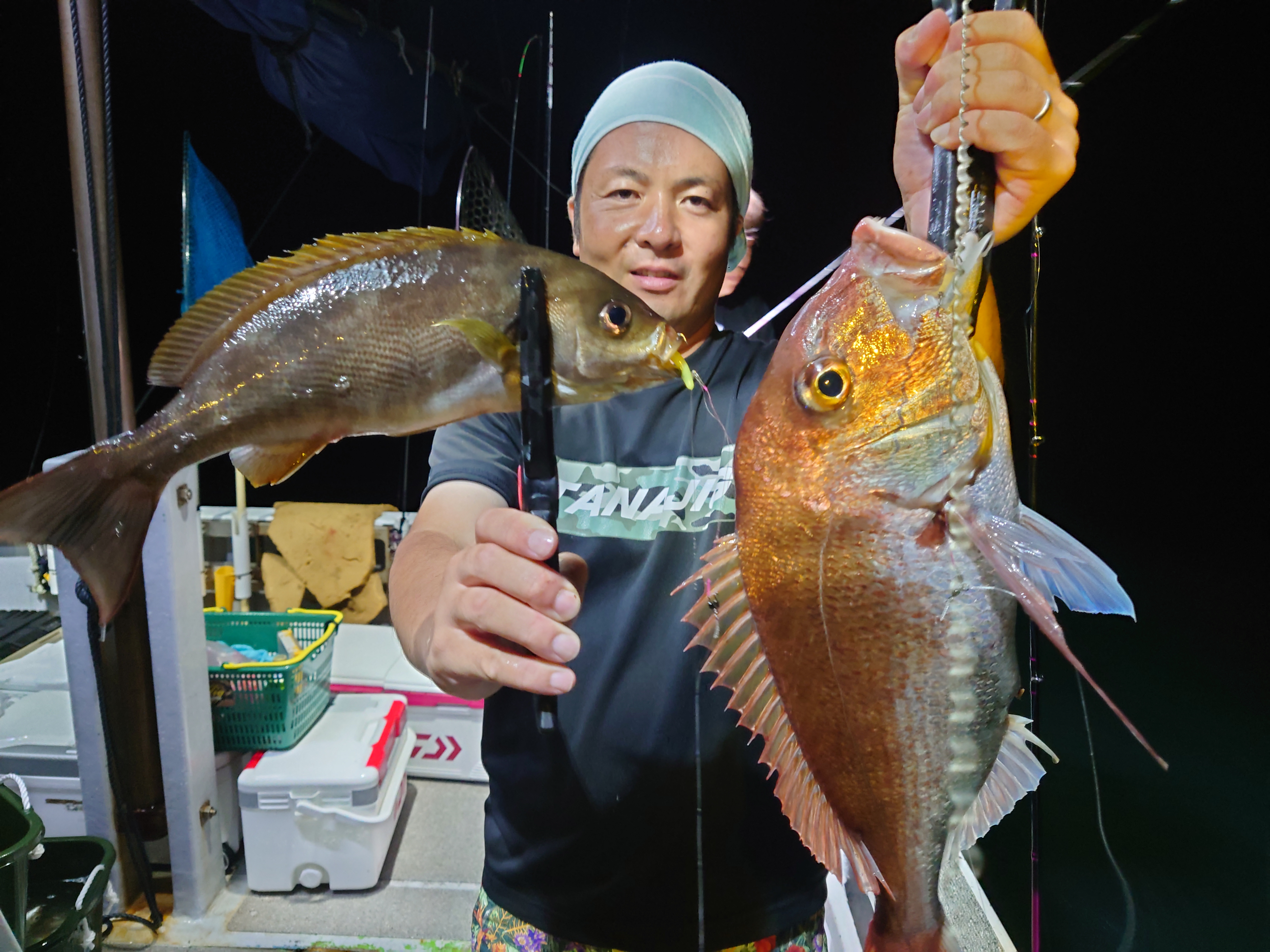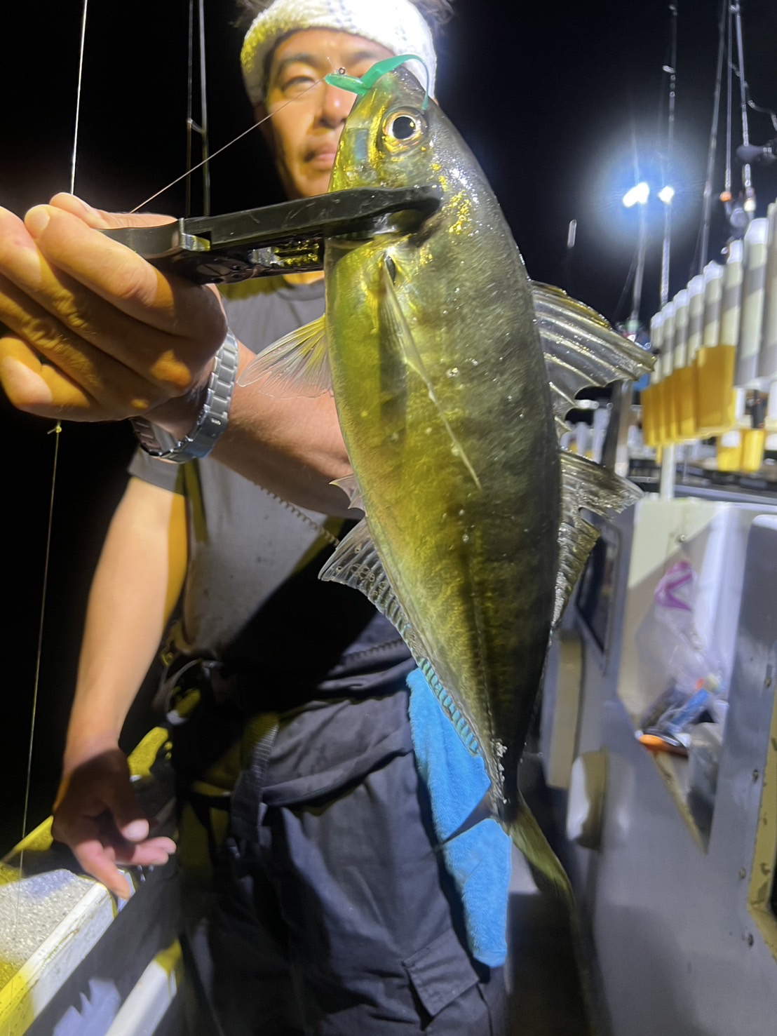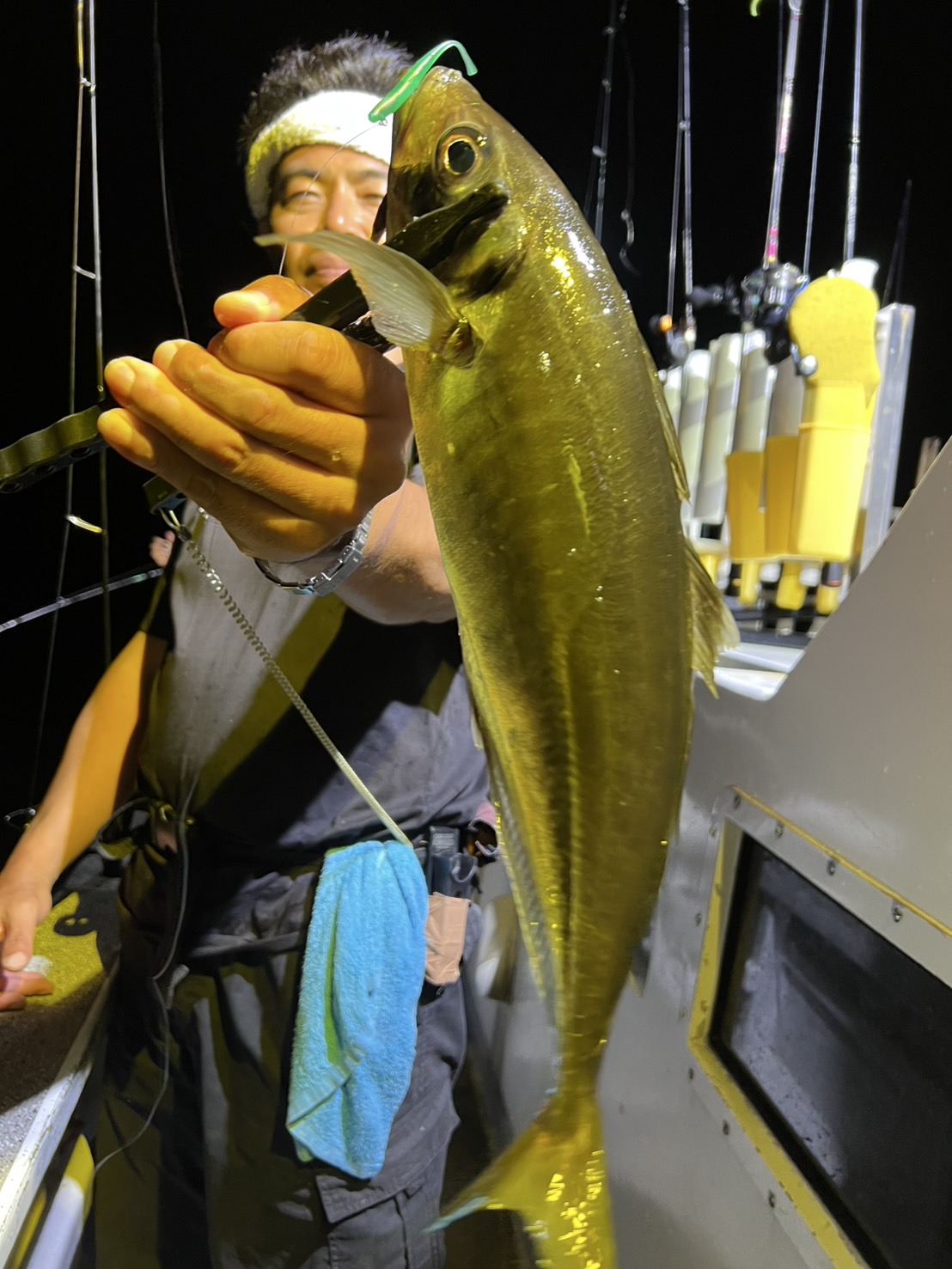 半夜バチコンで鳥羽石鏡のオーシャンズマロンさんに釣行。19時頃出船して19時半頃から釣り開始で23時過ぎまで料金9,000円でリーズナブル価格。船はタテて流し釣り両舷で竿出し可能です。オモリは25号~30号、ワームはタナジグさんの鯵あいや~チャートやグリーンを使用。スタートからイサキがアタリだらけで次々にイサキが船に上がります。イサキの小型はリリース、鯵は2本でしたが43~48cm前後とデカイのが釣れました。ほぼ入れる度にアタリがあり後は掛けられるかどうか?穂先の硬い竿柔らかい竿を比べてみましたがどちらでも釣れましたが柔らかい方がルアーを咥える時間が長い感じで釣やすい。これだけアタルと鯵あいや~は無双の強さでヅレない切れないで釣り続けられる。特に夜は見にくい中高年にも強い味方です。60近い真鯛も上がるフックの強さで大物にも安心です。瞬間接着剤でワームとジグヘッドで固定するとまさに最強です是非お試しください。