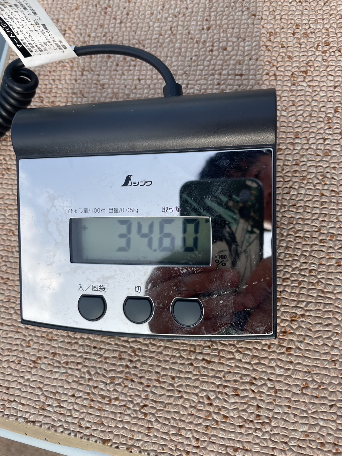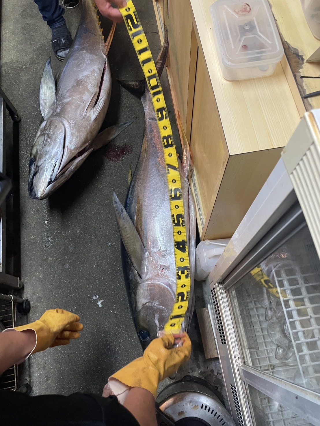 船縁でマグロが旋回するので上半身乗り出してでもスレるのを交わして下から出てくる時に一気に巻いて無事キャッチ!ワタヌキ34キロ、135センチのキハダでした!