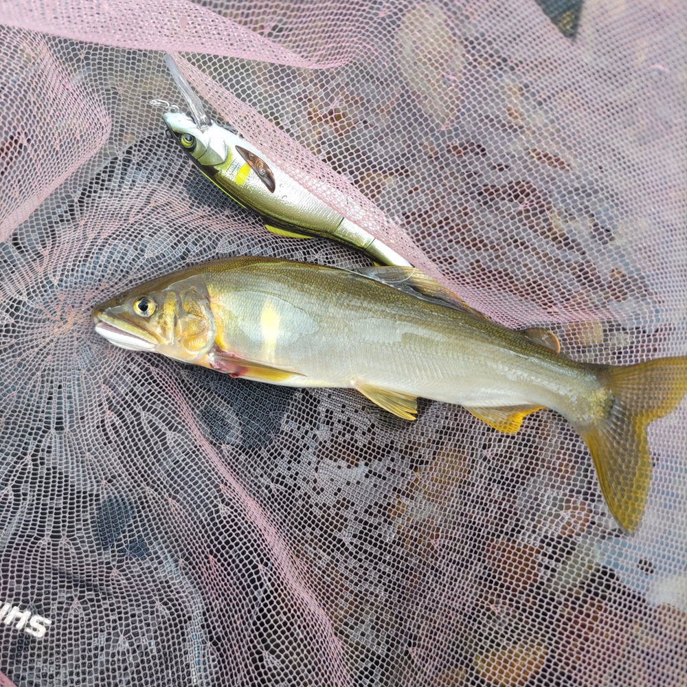 鮎は見えるのでヒットするだろうとオトリミノー104を泳がせます。チャラ瀬では鮎が見えますが思うように掛かってくれません!1時間でポイント移動します。次のポイントは瀬肩から釣っていきます。すると早速ヒットします。その後も瀬とは言えませんが流れが強いポイントを集中して釣ります。