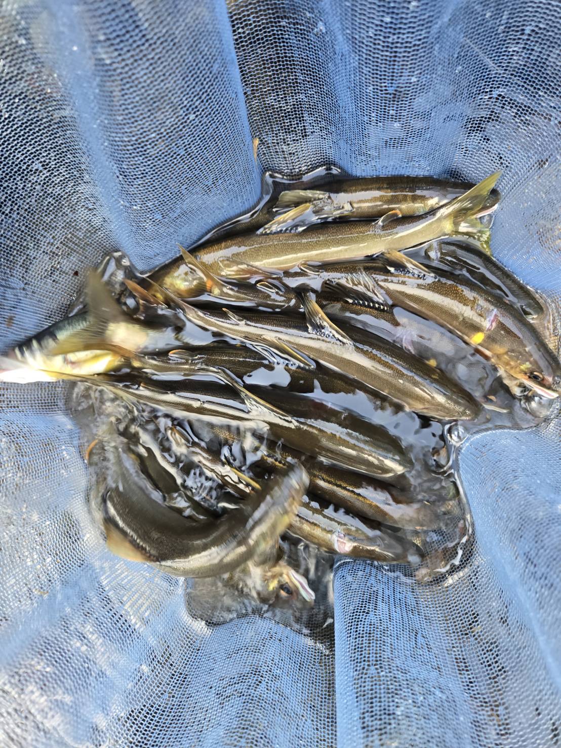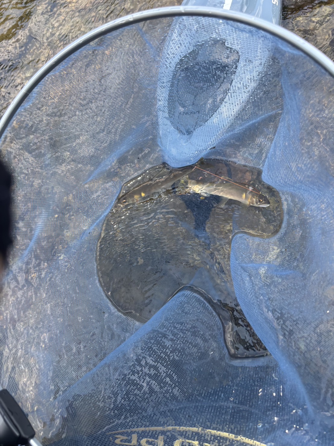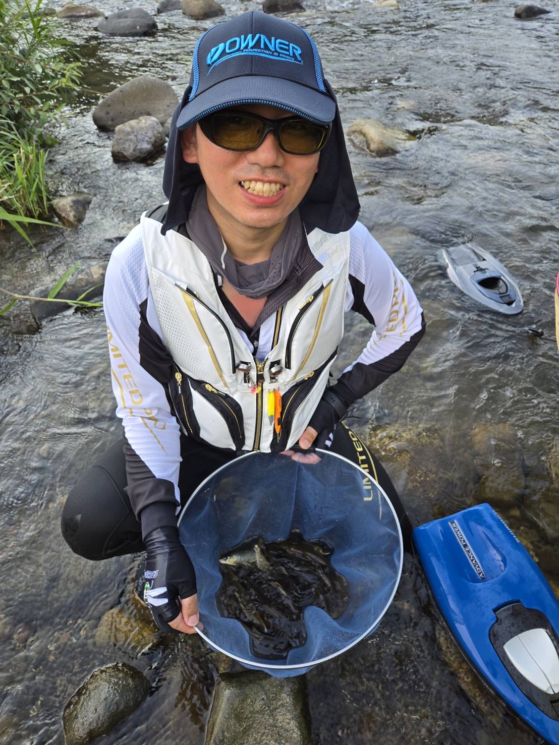 私の鮎釣りチャレンジがついに始まりました!昨年一度体験させていただき、今年は一式揃えての挑戦です!今回は、フィッシング遊各店メンバーでの釣行会です。一宮店から約2時間半の険しい道のりを乗り越えまずは足羽川 田中商店さんに立ち寄りオトリと日釣り券を購入。ポイントも教えていただけました!!HPコチラ 野村チーフに私の引き舟を持っていただき私は竿だけ持って川を歩いていきますが野村チーフが速過ぎて追い付けませんがとにかく後ろを付いていきます。ポイントに到着したころには足はすでにプルプルしています。仕掛けのセットをし、いざ実釣です。いろんなポイントを探り1時間ぐらい経ってようやく天然の1匹めをゲット。そこからポツリポツリと釣ったころ野村チーフが他のメンバーの指導にいったときになんと鮎を掛けちゃいました!ご指導を思い出しながらなんとかゲットしますがオトリ交換の際にやっちゃいました!!私の手から鮎が脱走です!そして今度は木に仕掛けが絡まりさらに竿が節落ち!!大ピンチですがなんとか脱出!休憩してからは反応イマイチでしたが夕方にポイントをチェンジ!!さらに険しい道を歩いていき、瀬を狙います。ここで怒涛の4連発!!でなんとかつ抜けをさせていただくことができました!!今回、私が用意した竿はシマノ スペシャル競SC90とダイワ アバンサー80Mの2本です。競SCは9mとは思えないほどの軽さと操作性が抜群でした!アバンサー80Mは75ー80のマルチレングスを選びました!風が吹いてきてからはコチラを使いました!良型鮎を掛けた時でもしっかりと竿でタメることができ、鮎を操ることが出来ました!どちらもオススメの一本です!