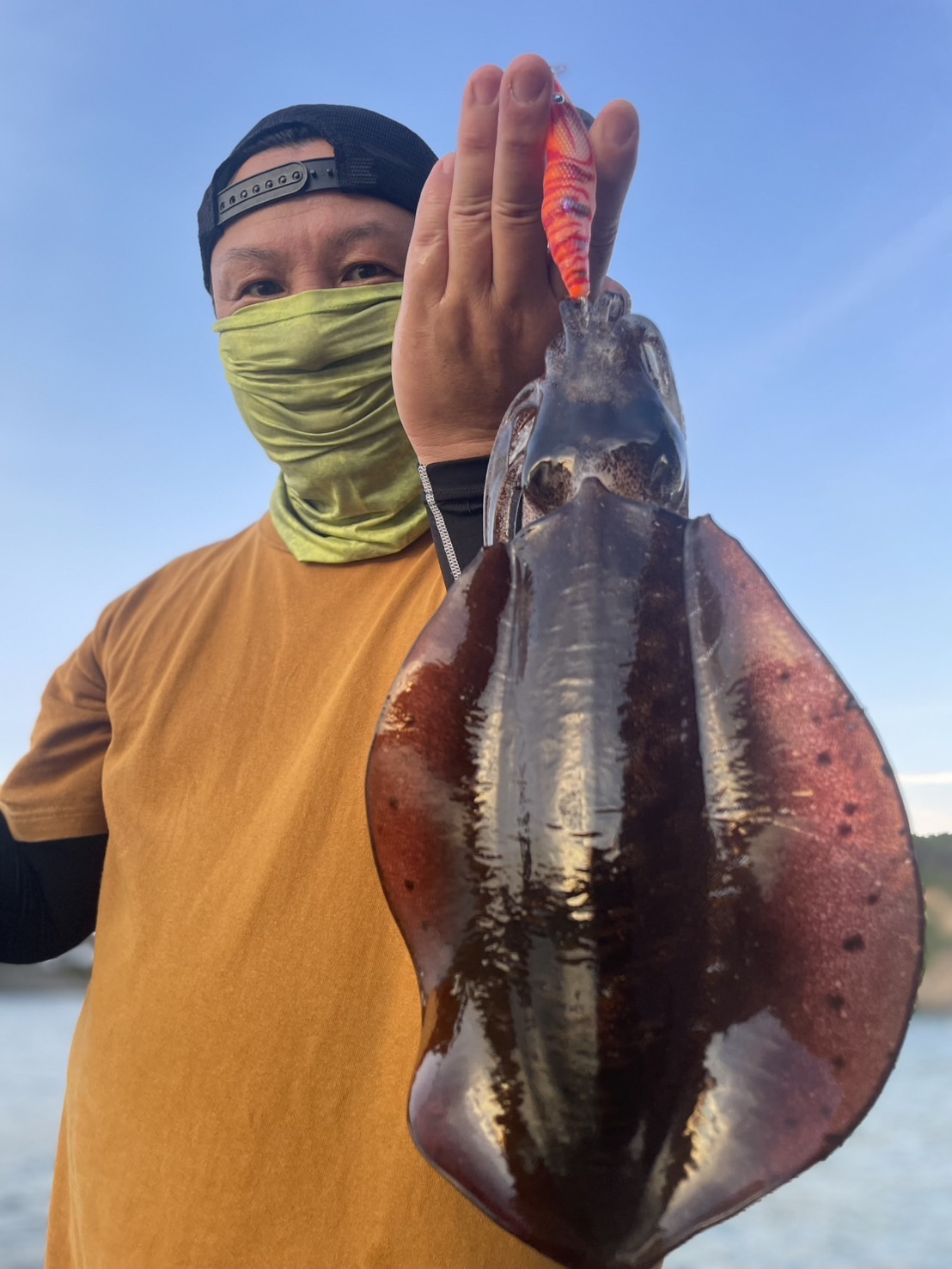 ここでメジャークラフトの新製品 餌木蔵シュリンプ3.0号を使ってみると「モゾっ」とした後、スゥーと引っ張るアタリが!!上がって来たのは700gのアオリイカでした!!その後もすぐに、もう一度「モゾっ」から乗せで今度は400gのアオリイカでした!