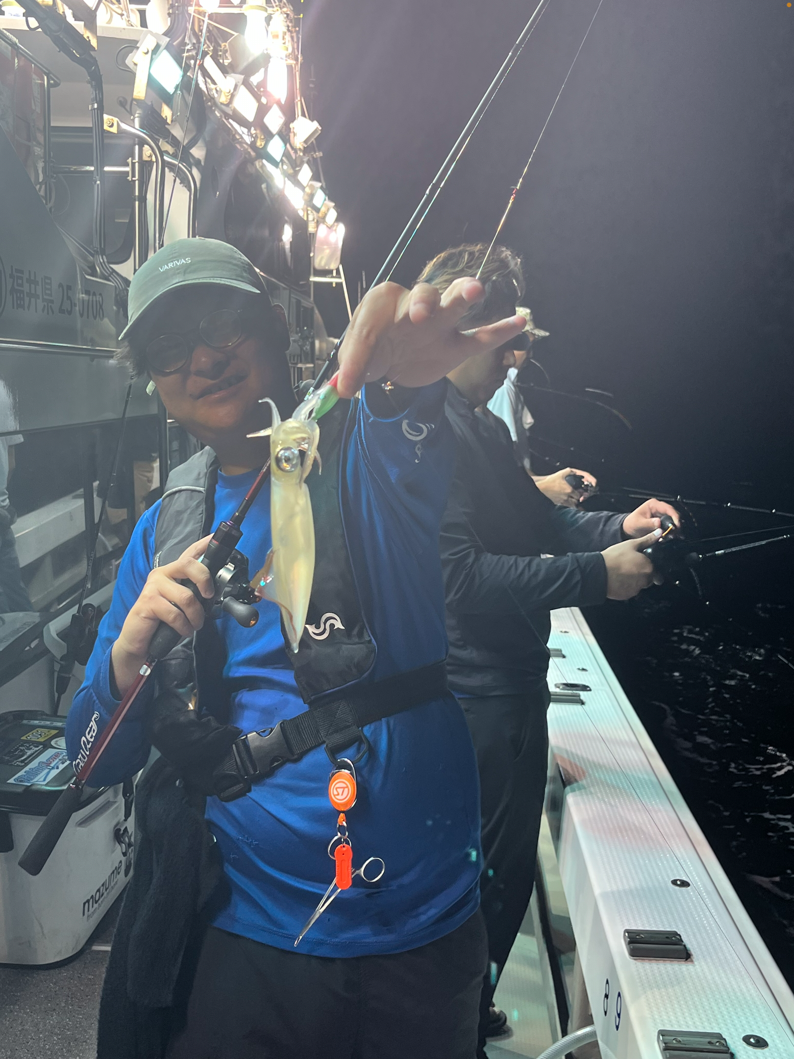 福井県色浜から出船の泰丸さんに遊メンバーでイカメタルに行ってきました。当日の水深は88mで、潮が少し早い状況でした。開始はスピニングでキャストしボトムからテンションフォールしている最中に何やら違和感。。。合わせると重みがあり、なんと船中ファーストヒット(笑)