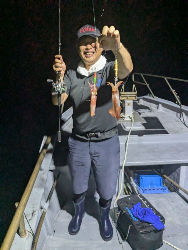 ここの所各所でイカメタルが好調との事で波切の「春夏丸」様にお世話になり行ってきました。仕事終わりに行ったので20:30頃出船。ポイントは港を出てすぐの所水深40m弱のポイントにアンカーを入れライトアップ!準備が出来次第投入なので取り敢えず様子見として20号のメタラーでボトム付近から巻き上げつつ探っていると20m程でヒット。一投目から既に浮いてきている。これは爆釣の予感と思っていたのも束の間。すぐさまイカパンチの猛攻からのフグ→サバの連続魚ヒットに翻弄される。どうにもこうにも誘いすぎるとサバがヒットしてくるのでそーっと置くように止めているとアカイカがヒット!今日はコレか?!適度に誘ってステイ多め→ヒット。このパターンで10ハイほど連続でヒット。その後もポツリポツリとヒットするが棚迷子気味で数が伸びずまた、潮止まりも重なり沈黙の時間が続く。深夜24時過ぎからまたアタリが復活しイカパンチだらけ少し波もあったのでノリバレも多発し楽しんだ割には数が少なくキャッチしたのは26ハイ。まだまだ修行が必要なので近々リベンジに行ってきます。
