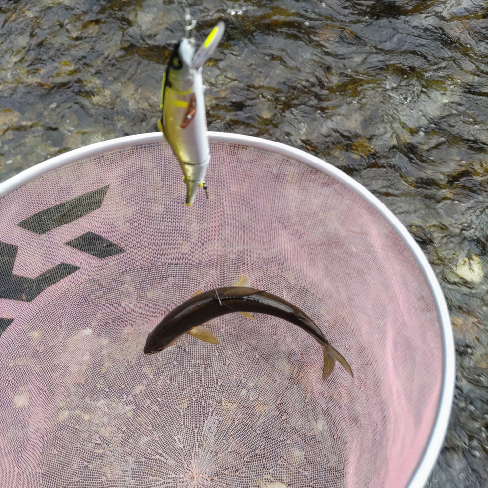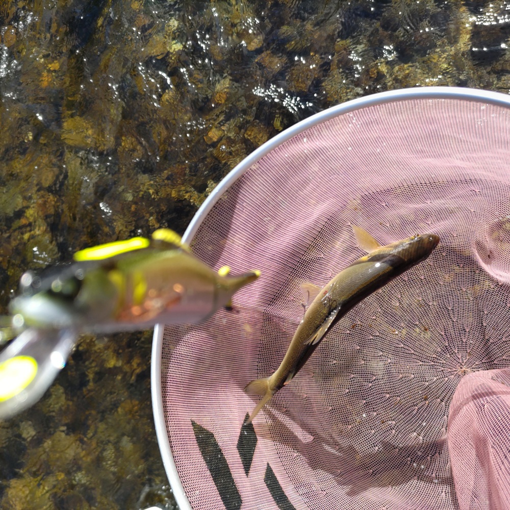 今回は少しづつ引き上げるイメージ(リールのハンドルを半回転づつ回して止めての繰り返し)でルアーを動かし止める時間を長めにするとギュイーン!という感じで鮎が掛かります。この瞬間がアユイングのメチャ楽しい瞬間ですね。アユイングミノー&エスケードジョインテッドを交互に使い鮎が連続で掛かりますがバラシも連続してしまう状態でした。
