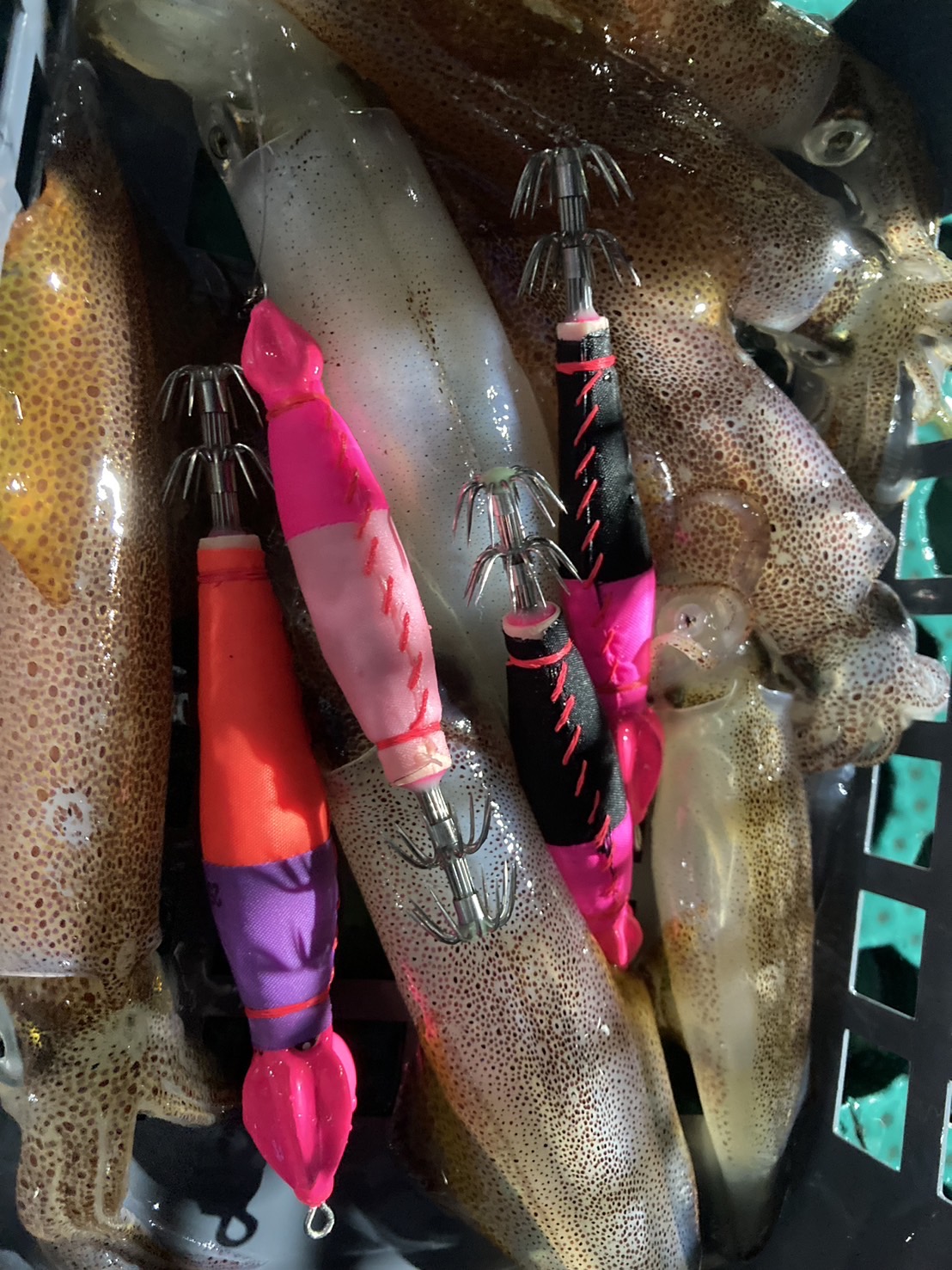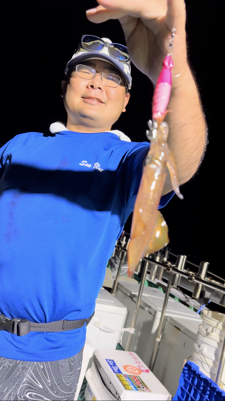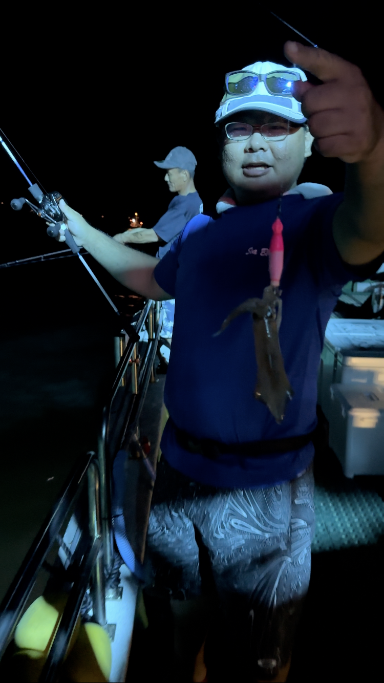 一投目、ボトムでフワフワ誘っていると、クンっと持っていくアタリでオロナミンCサイズのケンサキをキャッチ。幸先いい感じです!