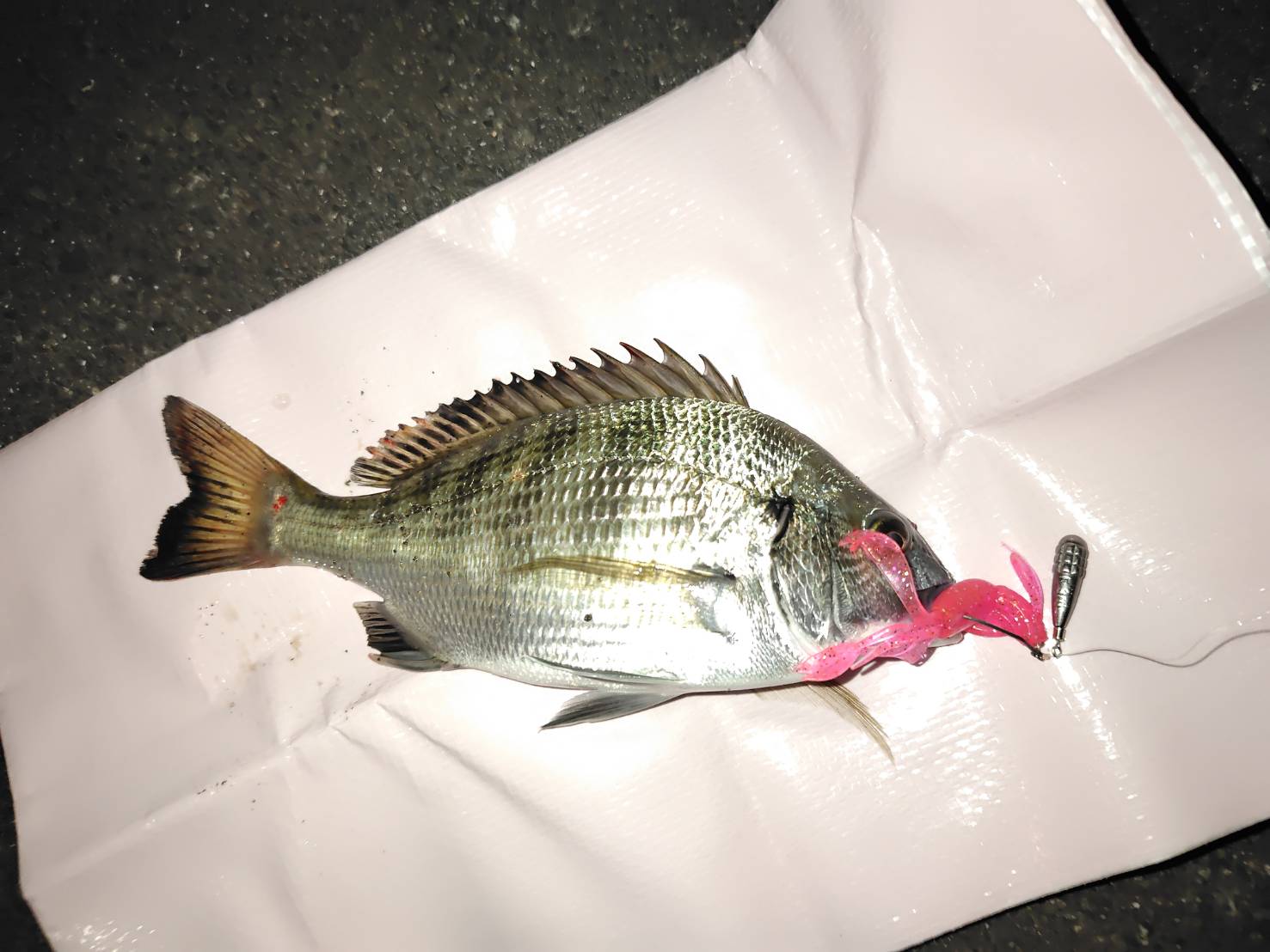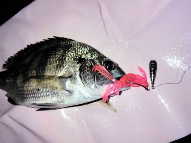 今年は伊勢店チニング部隊大苦戦中です(^_^;)昨年同様に宮川へ通ってはいますがなかなか釣果を出すことができません。この日も伊勢店のチニング部隊との釣行でしたがやはり苦戦。しかし諦めずに伊勢店オリカラのバブリーロゼを投げ続けていると回収間近にアタリが!アワセを入れると生命感はありますが想定している重みや引きではありません。回収間近ということもありすぐに抜き上げると写真のチヌでした(・o・)小型ですが久しぶりの釣果でうれしい1枚となりました!