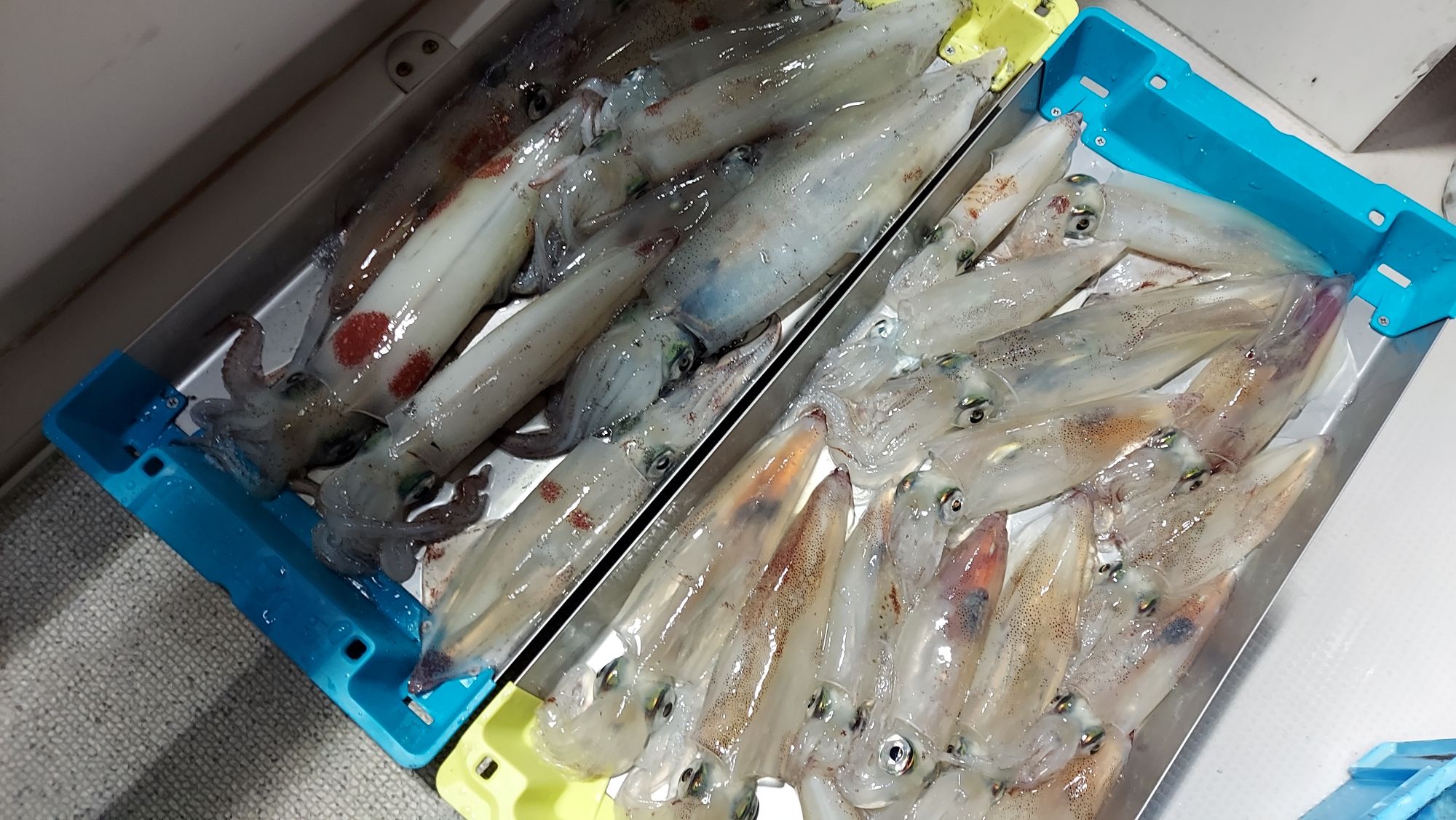 色が浜のアクションズさんにお世話になりイカメタル釣行に行って来ました!今回単独釣行だったのですが、同じ日に一宮店のチーフ小菅さん、西村さん、阿部さんと常連のお客様のグループとばったり会いました。みなさんは泰丸さんで予約されていました。平日でしたが、どのイカメタル船も大勢のお客様で賑わっていました。午後18時に泰丸さんに続き出船!ポイントは案外近めでした。水深80~90mで最初は明るいうちはメタルの25号統一でボトムを探りましたが無反応・・・船長曰く最近は19:50くらいから釣れ始めるとのことそれまでは我慢です。おかしいぞ~20時になっても釣れない・・・釣り座の反対側とお隣さんが釣れ始めました。明かりを点灯した後は深くても50mまで探って下さいと指示がありメタルを20号に変更しました。この後やっと私にも本命のマイカが釣れました。良く釣れたのは20~40mの棚でした。浅棚になるにつれてメタルを15号、12号とどんどん軽くしていきました。反応が良かったカラーは赤緑と赤黄色でした。このカラーでスッテとメタルをマメにカラーチェンジして23時の終了時間までに25杯釣れました。フォールで良いサイズのマイカにひったくられ落ちパク状態でダブルヒットもあり楽しい夜遊びになりました。初めてアクションズさんに行きましたが船長も女将さんも優しくとても良い船宿さんで安心して釣行出来ました!またお邪魔したいです。