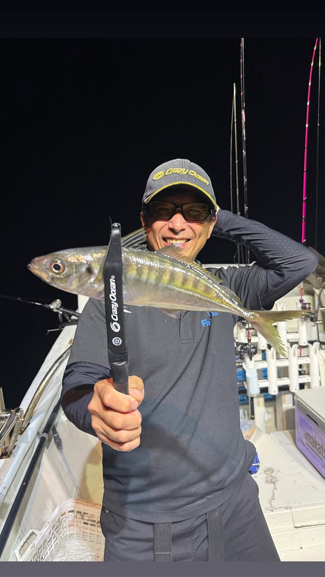 三種釣りの内訳はイカメタル、バチコン、テンヤタチウオ・・・どれも釣りたい!!午後6時集合。全員の準備が出来たらゆるりと出船。ポイントまでは40分くらい。まだ明るいので、とりあえずアカイカ狙い。水深は54mほど。ボトムから探ってくるも反応は無。船中最初の1杯は7時50分頃。集魚ライトが点灯してから30分くらい。隣の釣り人がバチコンで良型のアジを釣り上げたので私もアジ釣り。こちらも反応は遠い・・・イカもポツリポツリと釣れ始め8時過ぎにようやく1杯目。棚は20m前後。プチラッシュかと思っても活性は上がり切らない感じ。イカの群れは大きくなさそうか⁇そうこうしていると、置き竿のバチコン仕掛けに30㎝超えのアジ!!少しして40cmくらいの良型アジ!!2匹釣ったのでアジはおしまい。タチウオテンヤに変更!!