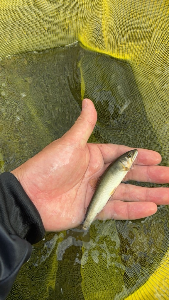 おとりを泳がすとすぐにビビビッーと目印が走り一匹目の鮎をタモキャッチ!