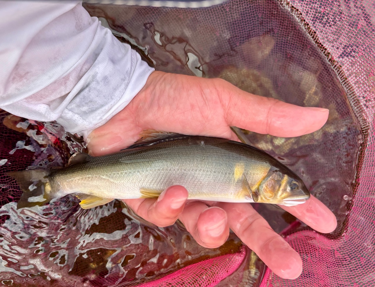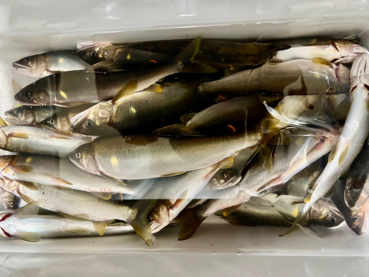 郡上へ鮎釣りに行ってきました。高鷲に入りました。瀬は0.8号のオモリを付けて、早瀬は背針を付けて釣りました。黄色い追い星がはっきり出てる鮎も多く、飛びついて掛かる鮎も見えて楽しい!午前中は10匹、昼からは上流側の釣り人がいなくなったので、良さそうなポイントを探り歩きながら21匹でした。鮎が成長してきたのか、20センチ頭に15〜16センチの鮎が多かったです。