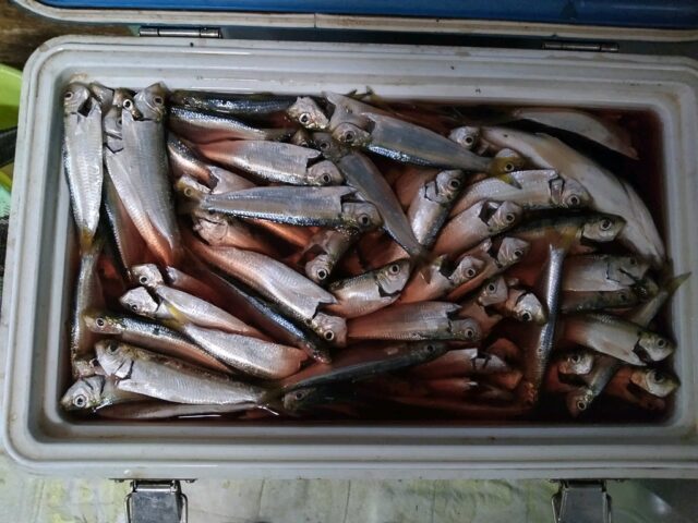 朝6時半頃から準備をして 空サビキ4本針を投げ始めると調子良く掛かり出し3連4連も多数あり手返しをとにかく丁寧にトラブル無く魚を外し血抜きをして投げるかを考え一気に数を増やしていきます。そしていきなりボラが掛かりやり取りをするもラインブレイクかと思いきや針折れでしたので仕掛けを交換する時にまら生きている針を2本追加して6本針で投げてみると見事に6本針パーフェクトを何回も行うことが出来 更にサッパを追加 針のバケが無くて金針だけでも普通に掛かってくるほど魚が居てくれて切りが無いので11時終了して魚をクーラーボックスに入れるのですが氷を抜かないとヤバイレベル・・・内ブタ無しで押し込んで氷ありの超絶満タンでした。数は472匹と結構な感じになり二晩目の釣りはキャンセルとなり片付けて12時に帰路につきました。