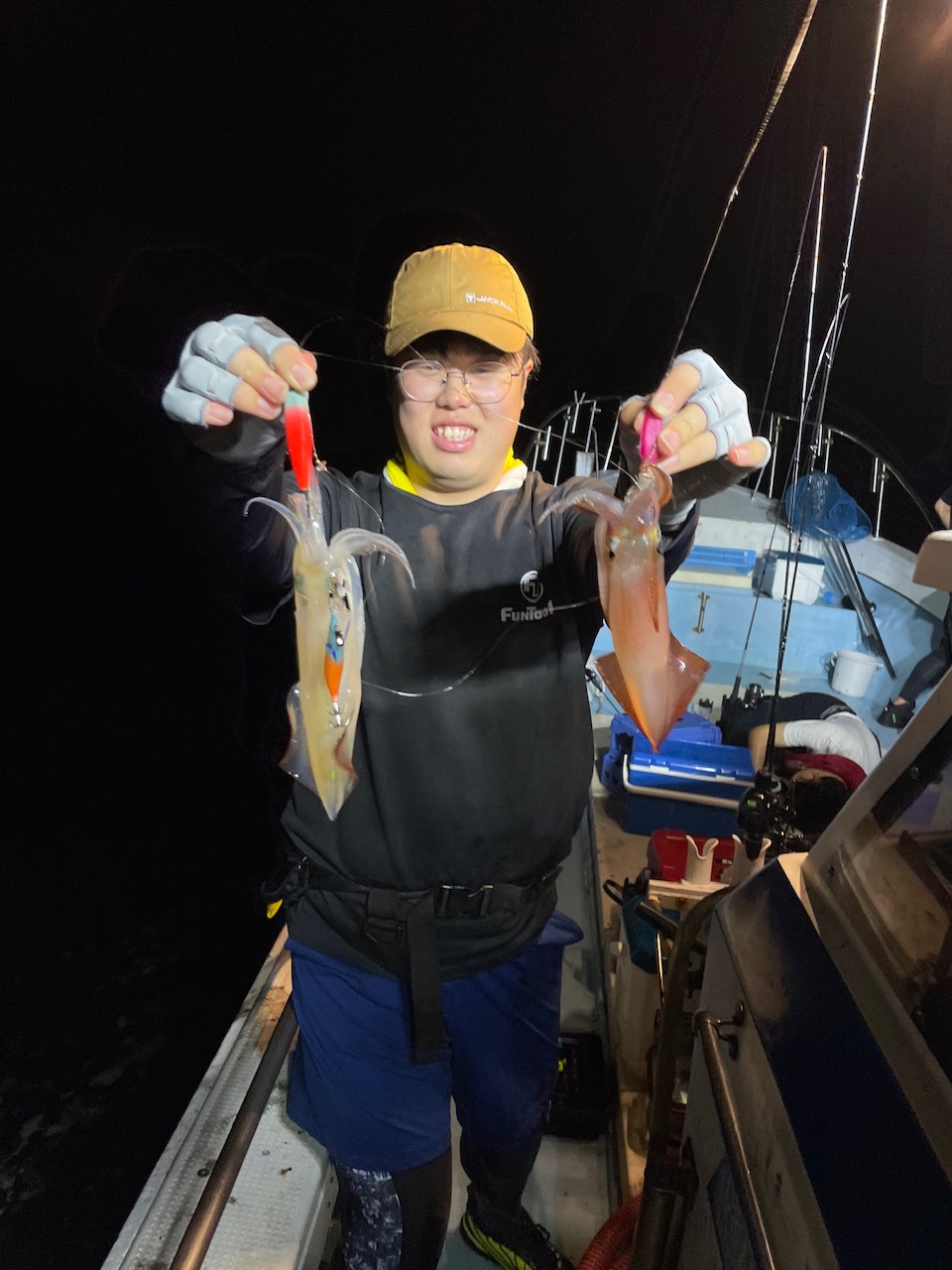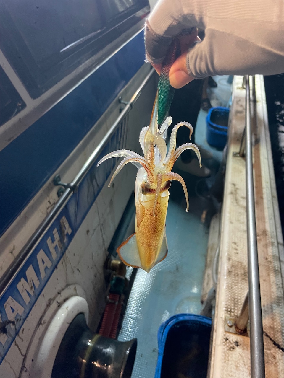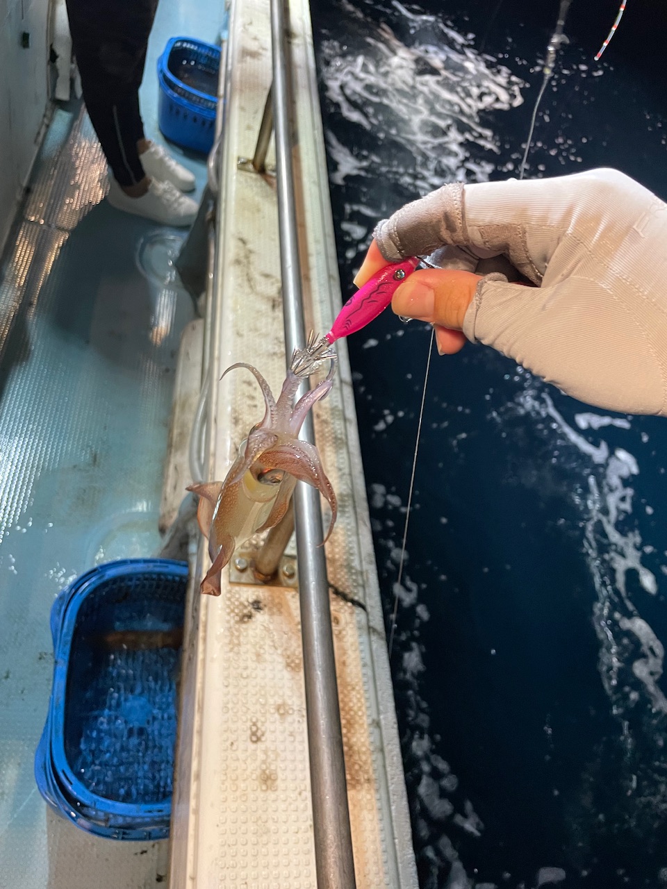 薄暗くなってきてライトも点灯。ボトム付近まで落としていると途中で糸がストップ!ヒット!1杯目!完全に日も暮れると20m付近で連発!今回はピンクがいい感じ?サンドバッカーVのピンクで連発!その後も10〜20m付近で釣れ続けました!ダブルは1度だけ、、ポツポツと釣れますがノリノリタイムがなく久々の船酔いでグロッキー、、そのまま復活できず終了しました。今が旬のイカメタル!!是非行ってみてください!