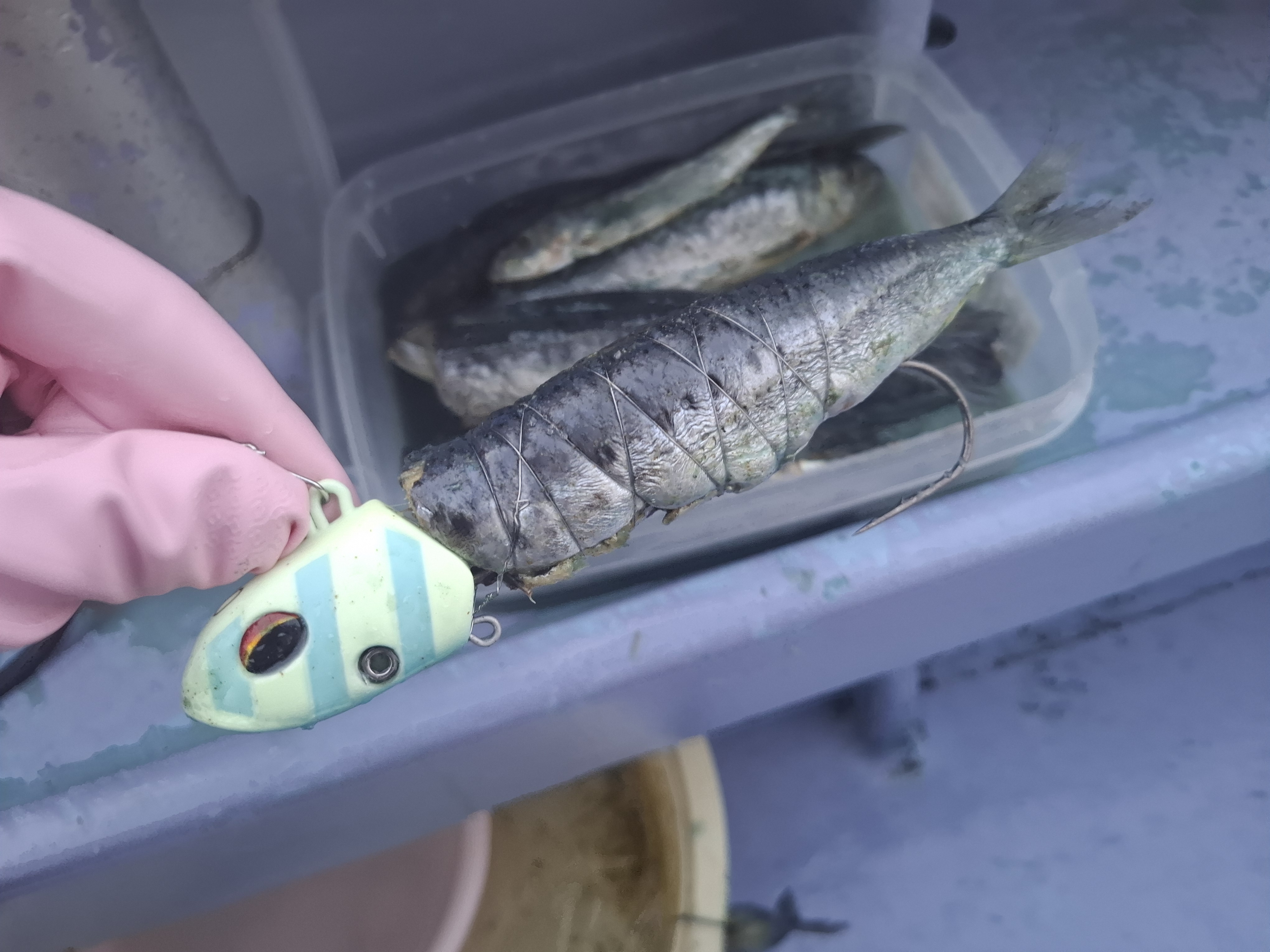 使ったテンヤはダイワのタチウオテンヤSSの50号、餌はダイワの激〆タチウオで塩締めしたイワシを使いました。
