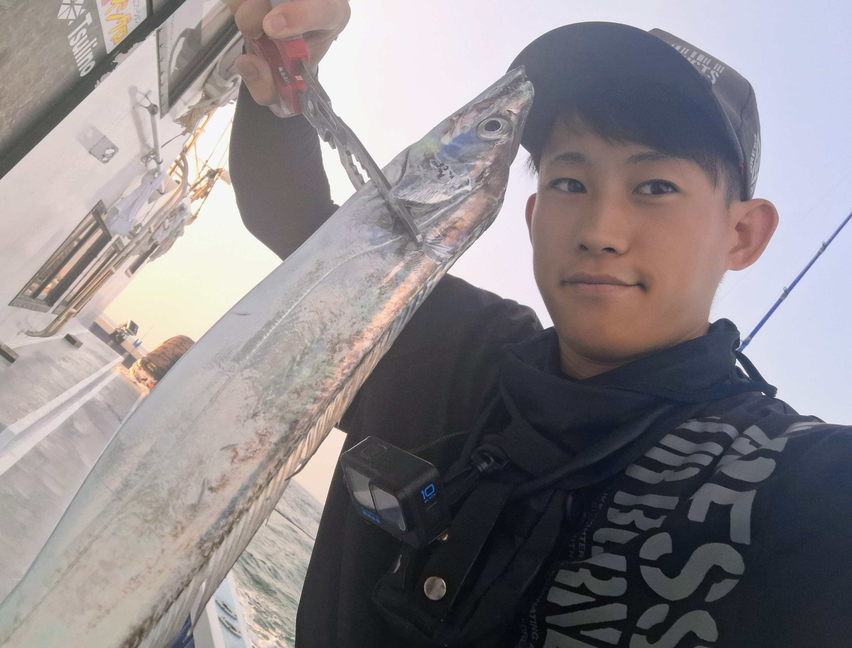 言われた通りに誘っていると、フワッと軽くなるアタリが!すぐに合わせると見事フッキング。上がってきたのは指4本くらいのタチウオでした!