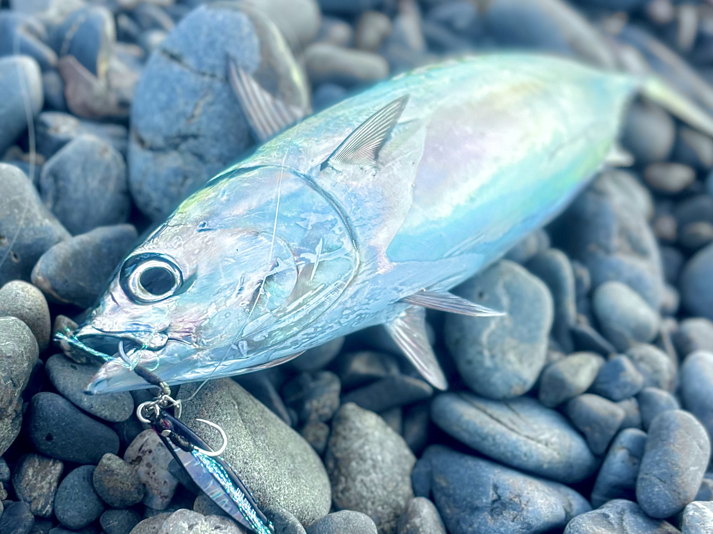 アクシデントがあって少し遅れてポイントに入ると、すでに何かを先行者の方が釣っていました!期待してキャストし始めますが、6時半まで全くアタリ無し…。ジグを2個もロストしてちょっとキツい展開でしたが、最近の傾向的に8時くらいまでは全然チャンスがあると思いキープキャスト!すると、手前のブレイクを回避する為に早巻きで回収していると突然ヒット!久しぶりのソウダガツオでした!ソウダがいるならと表層付近を素早くリフトアンドフォールで探っていくことでもう一匹追加出来ました!色違いですが、ヒットルアーはどちらもジャクソンのメタルエフェクトロングキャスト22gでした!