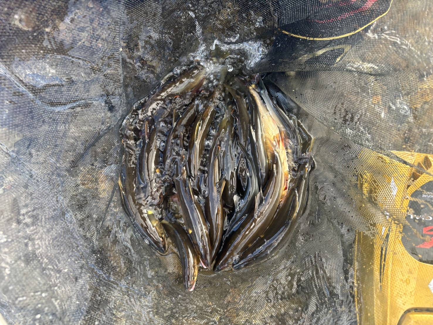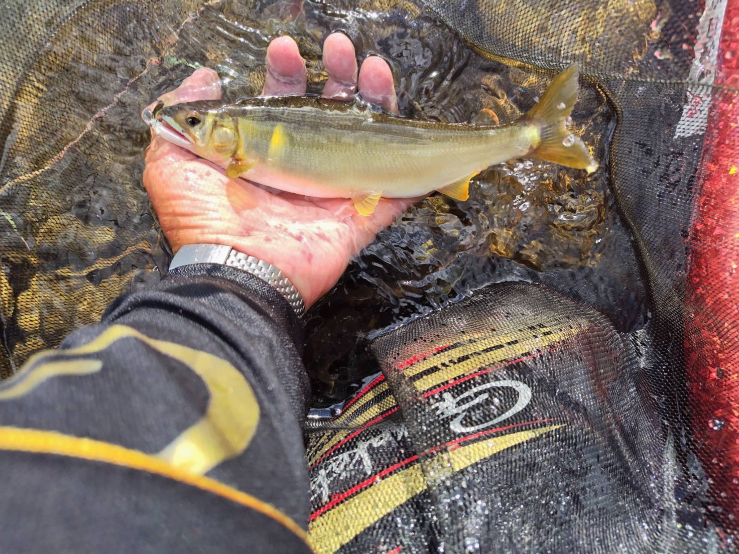 午後は、周辺を見渡して一番水深があるであろう瀬落ちから再開。ポツポツながら24cmまで良型揃いで7尾を取り込み、さらに「数釣り」を狙い、「数」といえばチャラ瀬だと考えますが、これが裏目で、2時間近く歩き回って痛恨のゼロ尾・・・(;’∀’)瀬落ちに戻り3尾追加したところで納竿としました。
