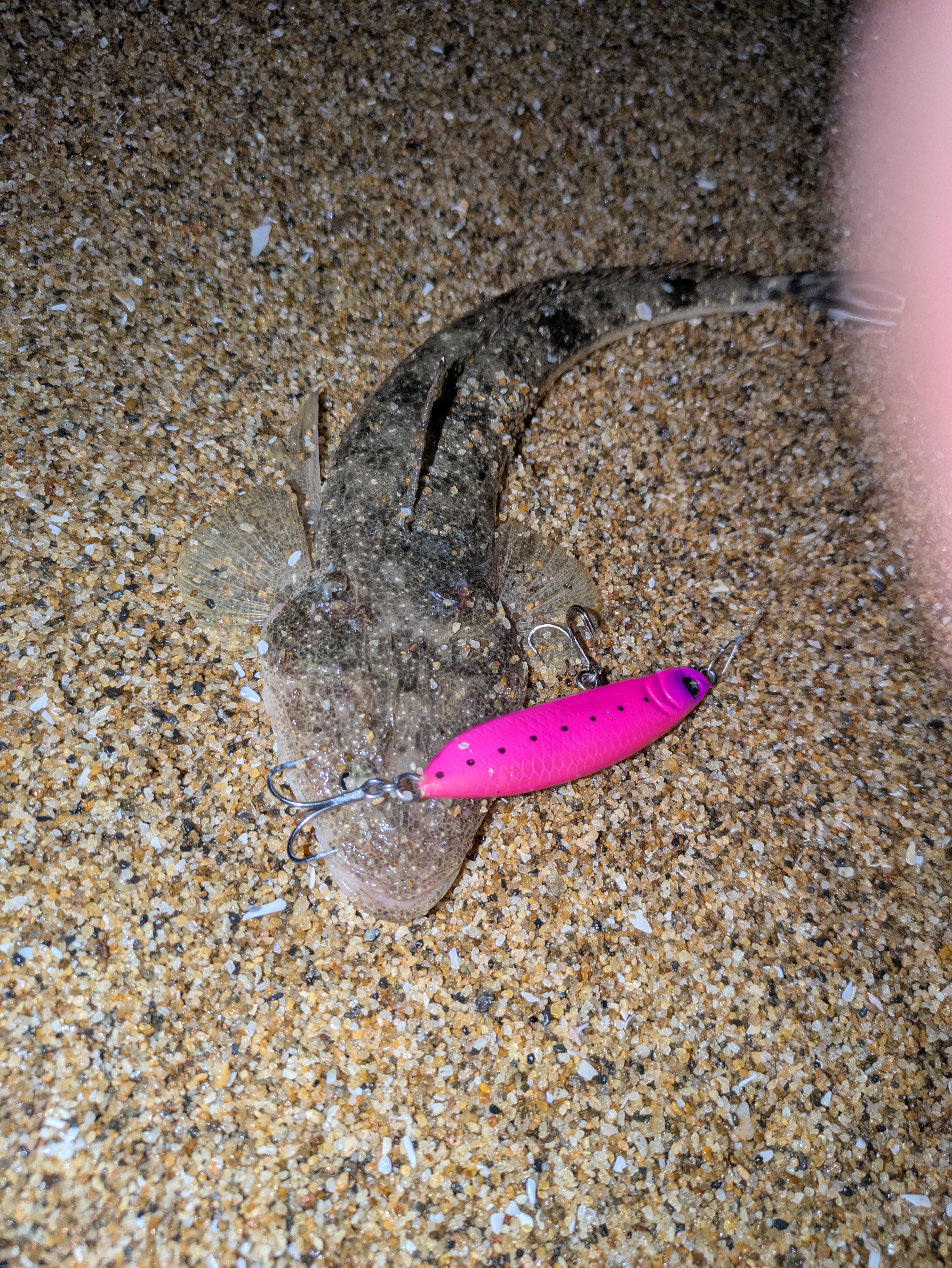ここ最近鮎釣りばかりしていたので、久しぶりにサーフ釣行へ行ってきました!夕方の風向きは無風との予報でしたが、雨雲の向きは明らかに北西へ移動しているので、雨が止んだタイミングを見計らっての釣行です。有名どころはかなりの人がいるであろうということで、人がいなさそうなところかつ潮が淀どみそうな場所を選んでエントリー!何時も通りフリッパーから開始!リフト&フォールさせながら横へ少し移動を繰り返しますが沖周りはベイト?になりそうなガッチョばかり…。ということでゆっくり誘える比重の軽いプラグでフットビー7522をセレクト!これが良かったのかポンポンと小さいですがマゴチが掛かります。ここで少し気づきましたが、どうやら20メートル四方のこの場所だけやたらマゴチが掛かってきます。サイズアップを狙いますがあまりにもサイズが小さすぎて申し訳なくなり、ポイント移動しました。次の場所は真水が絡むような小さなポイントをセレクト。手前20メートルをフットビー7522で細かく誘うとヒット!先程のチビマゴチよりも全然引きますが、首を振りません。あがってきたのはまさかのヒラメ。この時期でもヒラメがいることにビックリ!狙っている時は釣れないのに狙わないと釣れるのがヒラメですよね!今回はこれで満足し、納竿しました。結果的にはフットビー7522でのちびマゴチは8匹。ヒラメ1匹、フリッパーでは2匹でした。