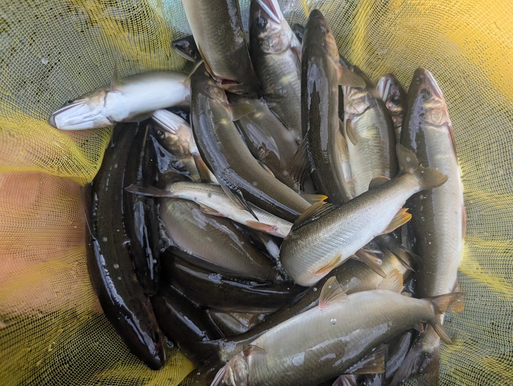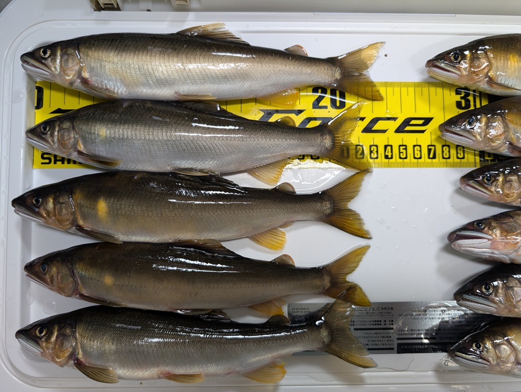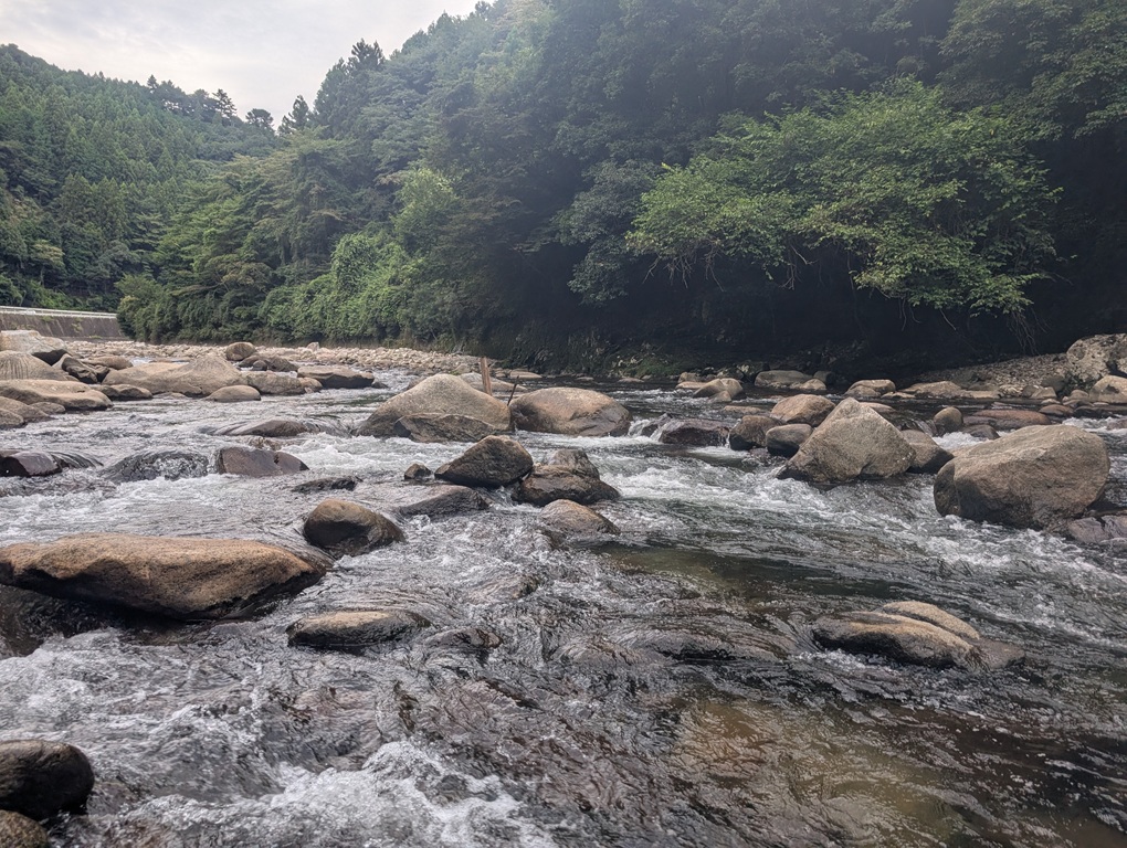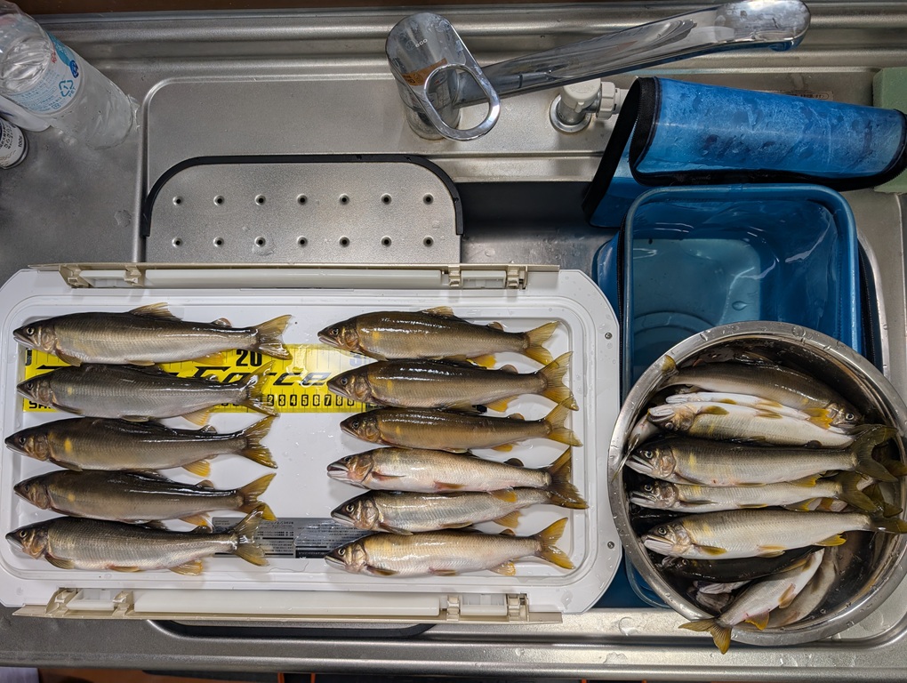 こんにちは~焼津街道店の三浦です。8月13日に寒狭川上流へ鮎釣りに行ってきました。当日は朝5時に出発し6時30分頃には夏目おとりに到着。日釣券とオトリを購入し6時50分頃から釣り開始。開始10分程で1匹目。その後は沈黙の時間が続き、1時間くらい経ったところで2匹目。その後もペース上がらず11時30分までに10匹。昼食後は少し下流で竿を出すも沈黙。午前中のポイントに戻り17時まで楽しみ22匹追加し32匹の釣果でした。サイズは19㎝~23㎝くらいまで平均サイズが良いので楽しめました。今回の釣行では1.2号のハリスが3回、0.8号の中ハリスが1回切られました。身切れやキャッチミスなどもあったので、しっかりと準備して釣行していればもう少し数を伸ばせたと思います。鮎のサイズが大きくアタリも強いので、イカリは7.5号以上の太軸がオススメですよ。