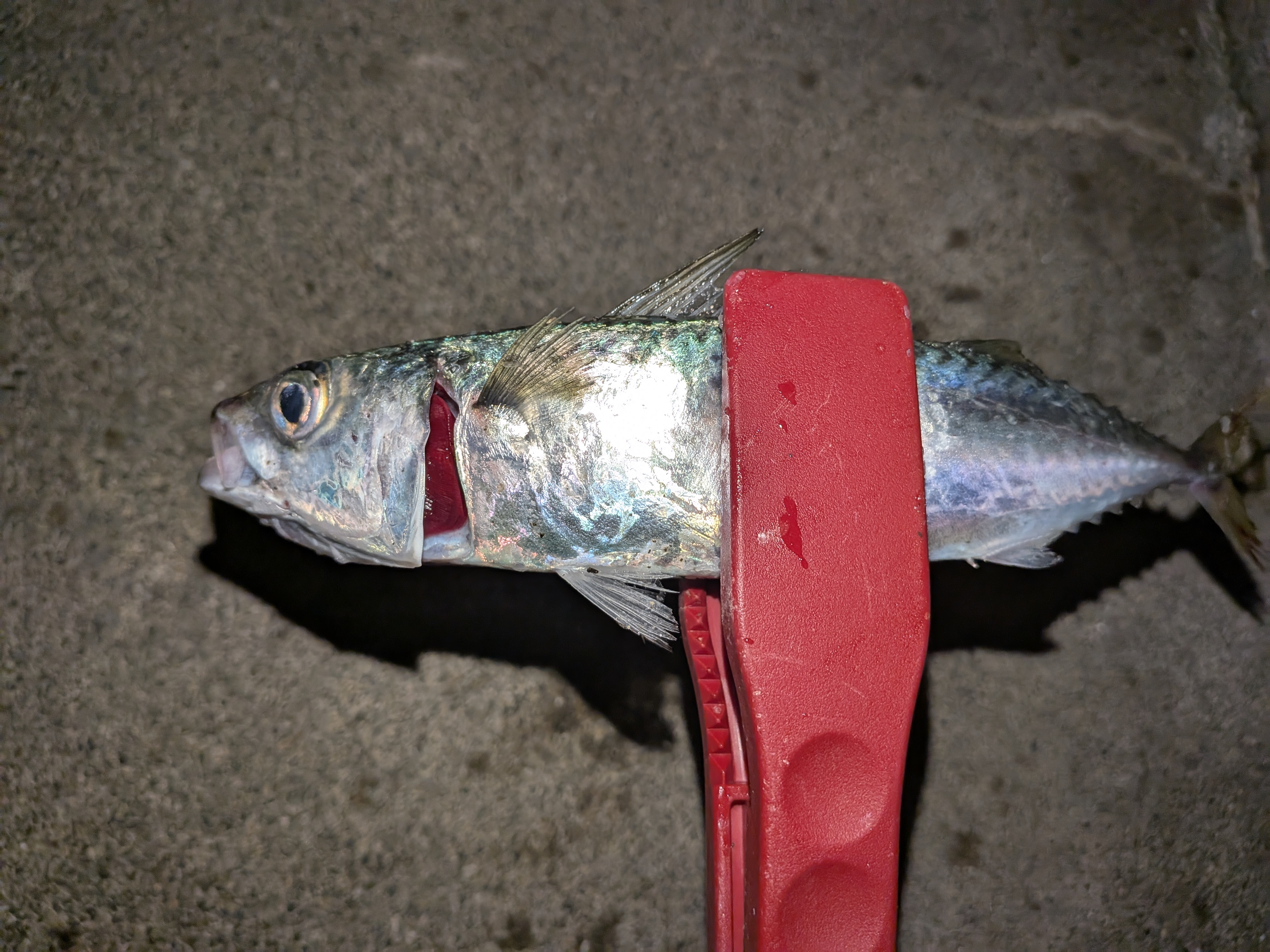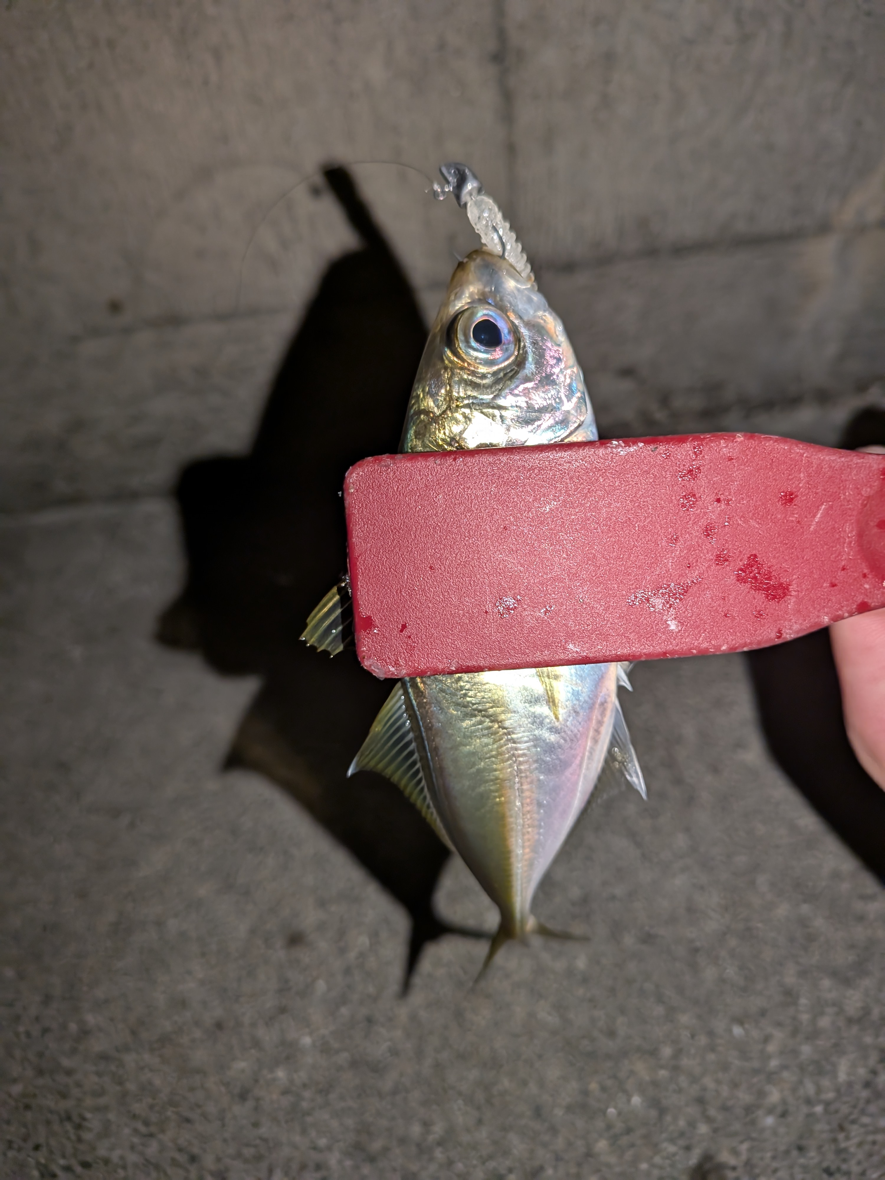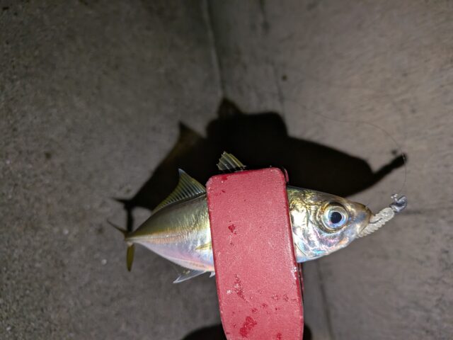 狙いの街灯下は先行者がいたので少し離れたところからキャスト開始。一投目から反応があり、カマスをゲット。しかし鉛筆サイズ…。
