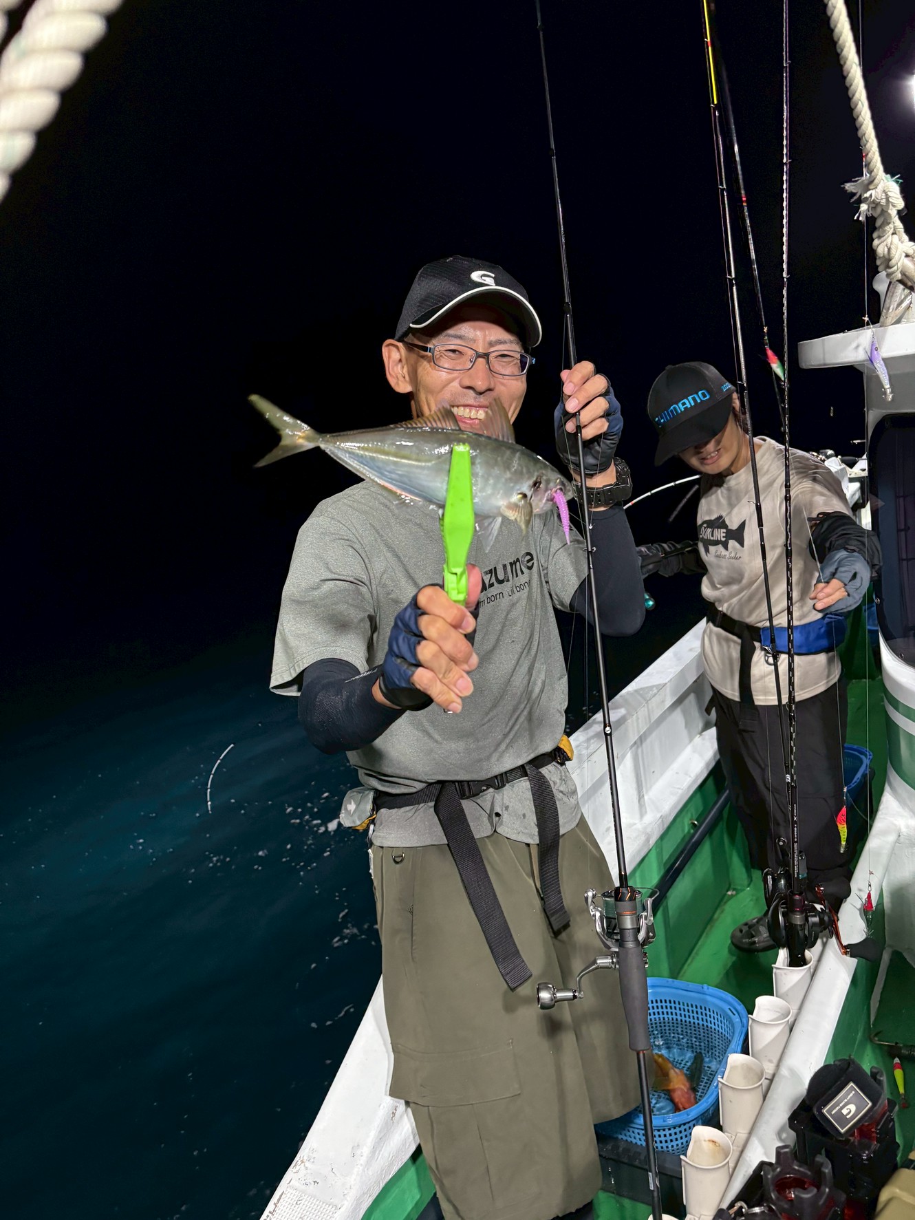 水深60mくらいの瀬にアンカーを打ち釣り開始。当たらない…当たらない…アタリがない時間が続きます・・・20時ころ同船者にようやく1杯目。30分くらいして、私にも待望の1杯目。しかし、続かない。隣では同行した34の社長やべさんが30㎝前後のアジ入れ食い!!34のアングさんもアジ無双!!横目で見ながらひたすらイカメタル。今回はオモリグ縛りで竿を出します。