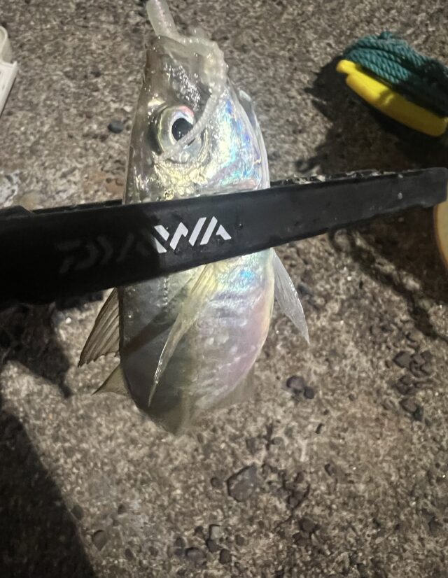 この日は仕事終わりに知多アジングに行って来ました。ポイントにつくと表面で何かがぱちゃぱちゃしています!とりあえずいつも通りレベロク様の豆アジヘッド0.4gにレインズ様のチビアジアダーを装着し表層付近をアクションさせてテンションフォールを繰り返していきます。すると1投目からもぞっとしたアタリ。アワセて巻いてくるとやはり期待通りのアジでした!しかも最近と比べて格段にサイズが上がっています。しかしスレるのが早く、かなりの短期決戦になりました。ワームを変えつつぱらぱらと釣り、数匹釣った後反応がなくなったためこの日は納竿。爆釣とまではいきませんでしたが何とかアジの引きを楽しむことが出来ました。