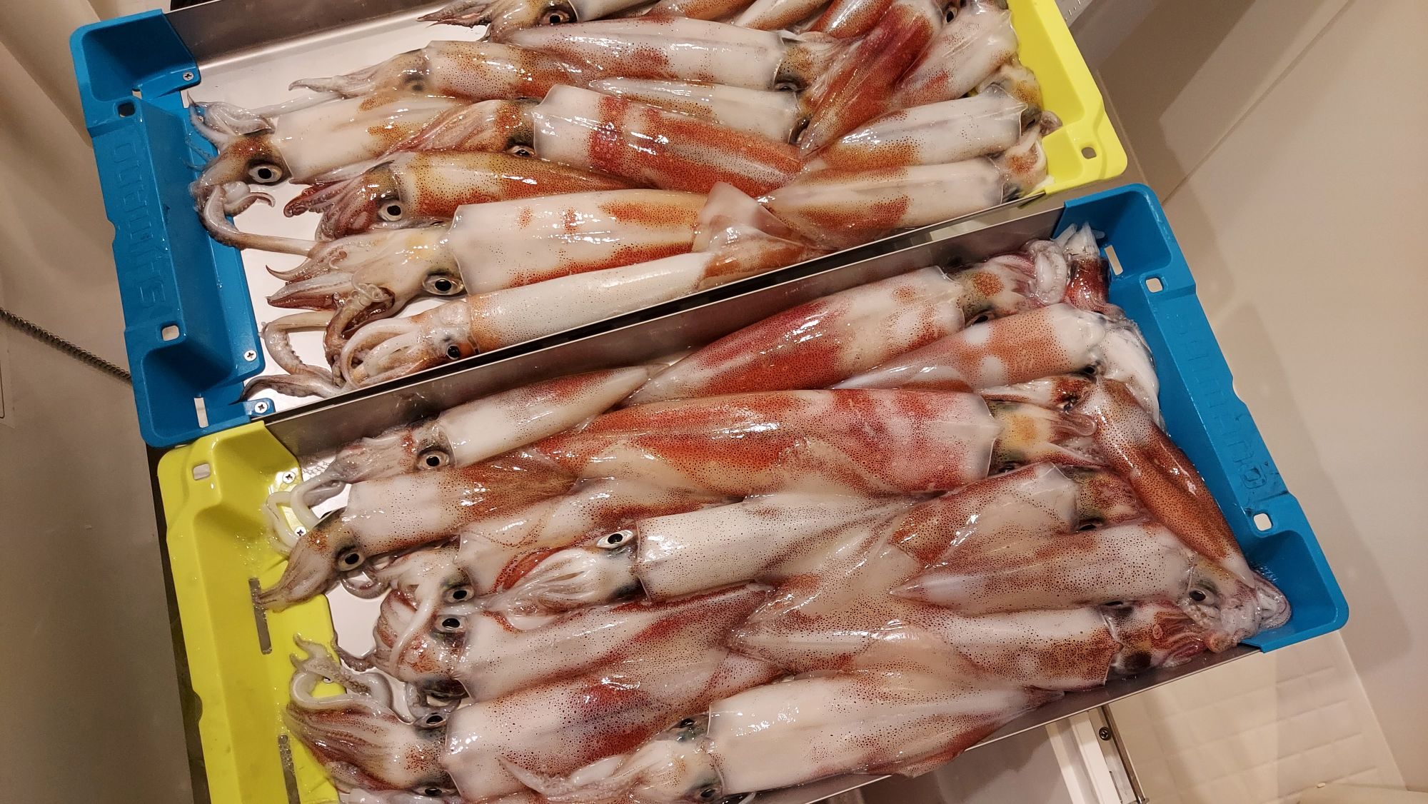 越前の金松丸様にお世話になりイカメタル釣行して来ました!先月は敦賀沖で釣行したので、今回は越前沖に挑戦。17時頃出船で、ポイントまでは越前海岸の雄大な景色を観てのんびり待ちます。まずはメタル20号からスタート。明るいうちは何もなく、19時頃から点灯するとアタリが出始めました。最初はボトム付近で探っていましたが、探りながら上げていくと55m~40mラインでアタリが頻発!幸先よく序盤からコンスタントにマイカが釣れます。潮の流れが緩いときや30mラインでアタリが出る時はメタルを15号~12号まで落としゆっくりフォールさせると良い感じです。16杯まで釣れたところでオマツリして船底に擦れたラインが高切れ・・・。もう1本のオモリグのスピニングでやってみてもなかなか掛からずリズムが悪くなり不調に。仕方なくリーダーを結び直し再度前半と同じような釣り方でポツポツと釣れるようになり終了ギリギリまでに31杯釣果。内容は釣れない時間や魚にイカを取られたり身切れもありでボチボチといったとこだと思っていましたが、なんと竿頭になっていました。ステッカーまで頂戴いたしまして大満足の釣行でした。