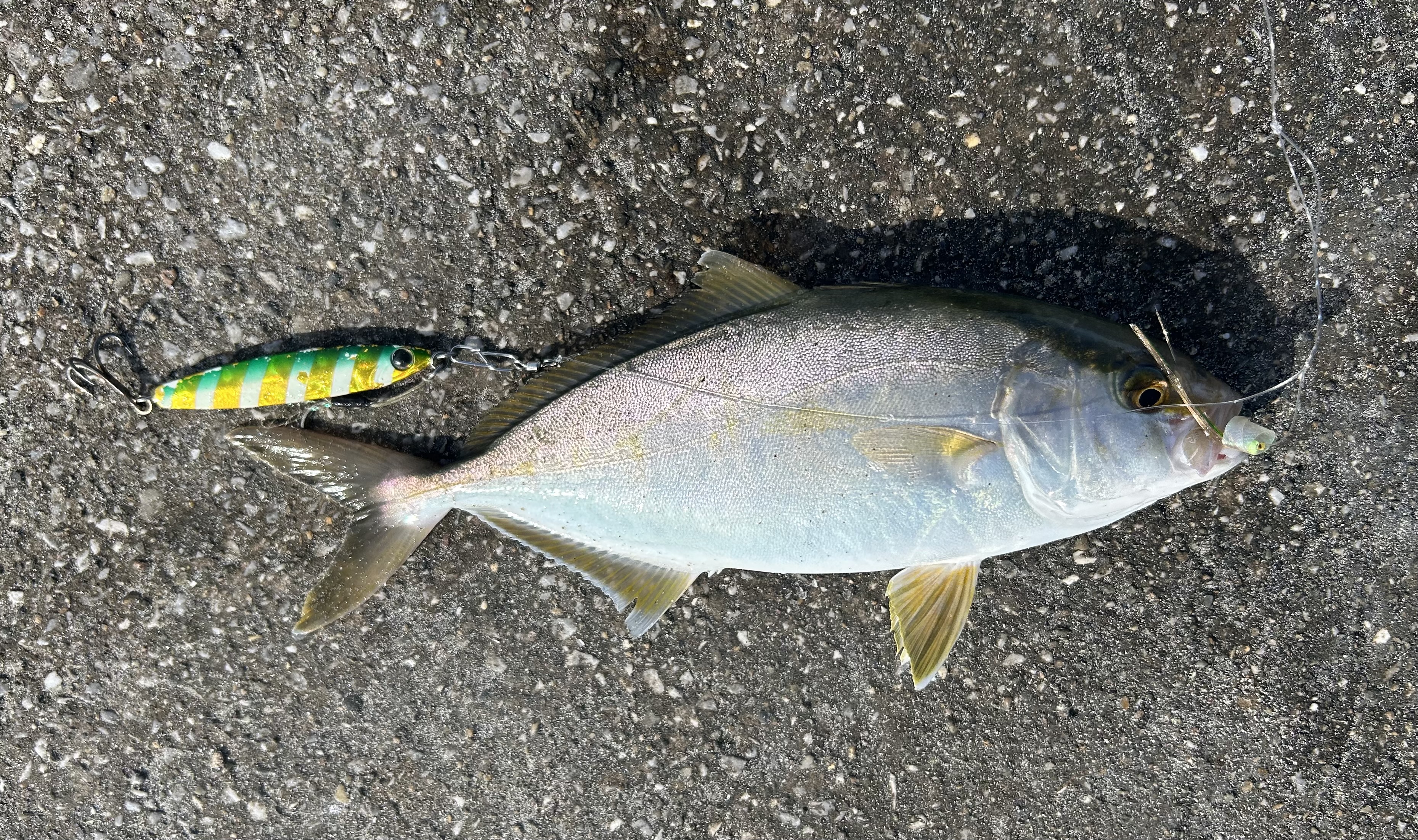 今回は遠州の堤防へ小型青物を狙いに行ってきました。開始時間は14時半からでした。到着した時は暑いので誰もいませんでしたが、15時になると地元の方達で堤防いっぱい。ちょっと遅かったら入れませんでした。小型青物にはジグサビキ!今回はジークのRサーディン40gを付けキャスト。表層からボトムまで探りますが反応無し。地元の方達は泳がせ釣りで青物狙い。しばらくすると泳がせの方がツバス。青物が入ってきたと集中すると私にもガツンと激しいバイト!!上がってきたのはカンパチの子供のシオ!その後ジアイ突入で周りでもシオが上がり始め、私も4匹GET!!サイズは小さいので、全てリリースしましたが、アタリが多く、入門者の方など青物が釣ってみたいと言う方は今がチャンスです。