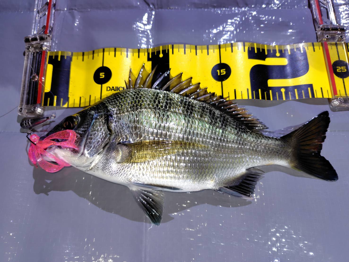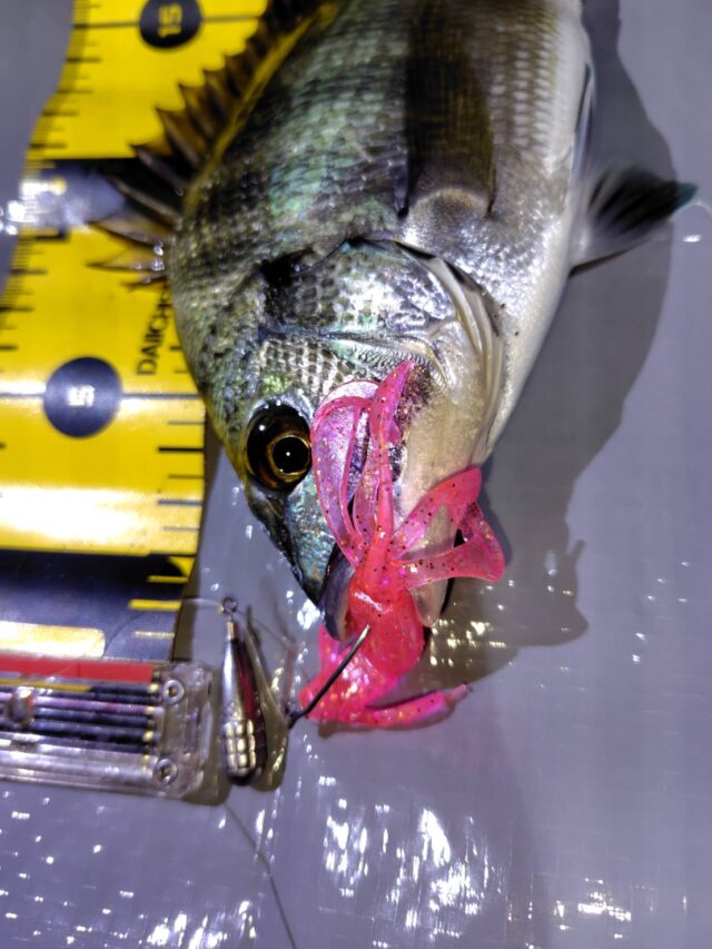 仕事終わりに伊勢店チニング部隊出動してきました!最近の釣果は30cm以下の小型が多く、ワームやフックサイズを下げようかと弱気になってしまいます(^_^;)しかしここでブレると迷走しそうなので宮川チニングで実績を出している伊勢店オリカラの「クレイジーフラッパーバブリーロゼ」をセット!開始早々に同行者にヒット!20cmクラスですが本命をゲット!私もアタリはあるもののなかなかフッキングまで持ち込めませんでしたかが諦めることなくキャストをつづけているとついにその時が!!24cmの小型ながら本命をゲット!伊勢店オリカラのバブリーロゼいい仕事してくれます\(^o^)/小型だけでなく大型のチヌもきっといるはず!まだまだチニングシーズン終われそうにもありません(^o^)