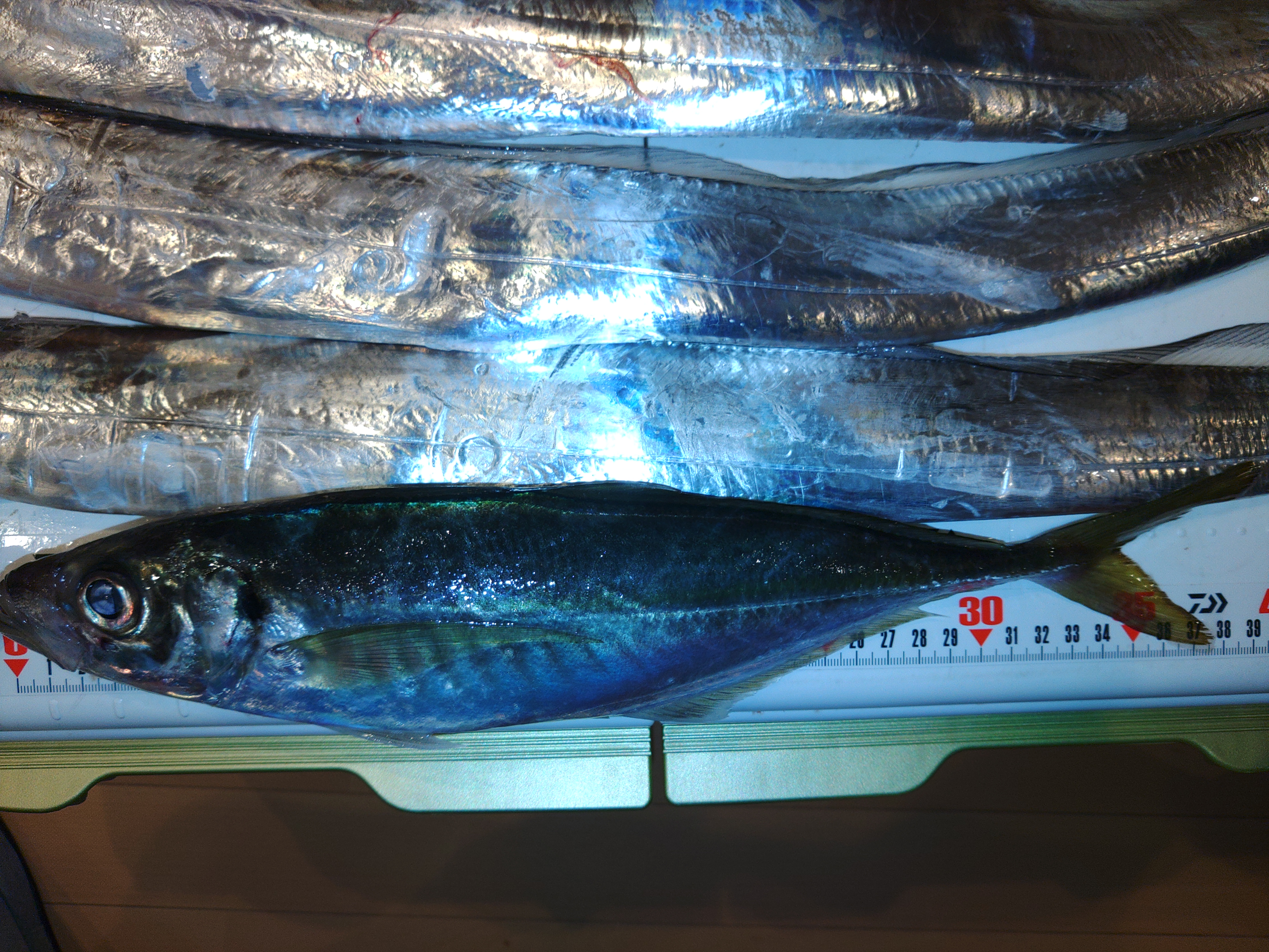 1投目から「コツコツ」とアタリがあり、しばらくすると竿先が大きく曲がったので慌てて巻き上げると指4本クラスのアベレージクラス?のタチウオをゲット! その後もコンスタントにアタリがあり、指5本クラスの良型も含め午前中に4匹釣れ、おまけに30㎝オーバーのアジも釣れました。しかし午後から西風とともに濁りも入り、何度もポイント移動を繰り返したがタチウオのアタリが全くなくなりPM3:00に納竿となりました。