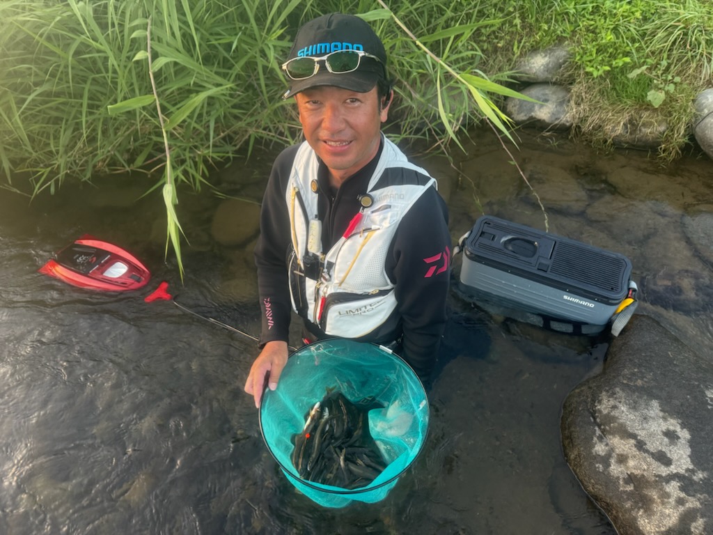 夕方は急流で型の良いまっ黄色な鮎がアタリ、引きともに楽しませてくれました。