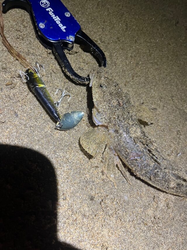 北勢サーフマゴチ!!! 本日イベントブロビス「ネクストスピン」でなんとか一本、、、と意気込んでいきましたが、、! なかなか口を使ってくれず、、、大苦戦、、 金曜日の夜ということで人はどんどん増えていき、ハイプレッシャーの中なんとか1匹!! 周囲の人もぼちぼち釣れていましたよ♪